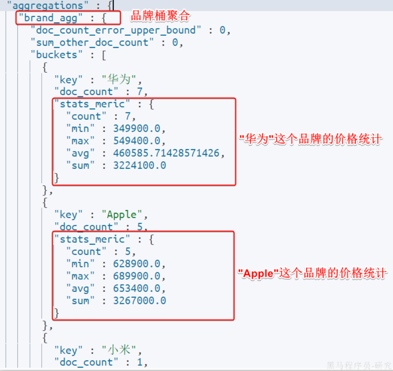 bashGET /items/_search { "query": { "bool": { "filter": [ { "term": { "category": "手机" } }, { "range": { "price": { "gte": 300000 } } } ] } }, "size": 0, "aggs": { "brand_agg": { "terms": { "field": "brand", "size": 20 } } } }聚合结果如下: