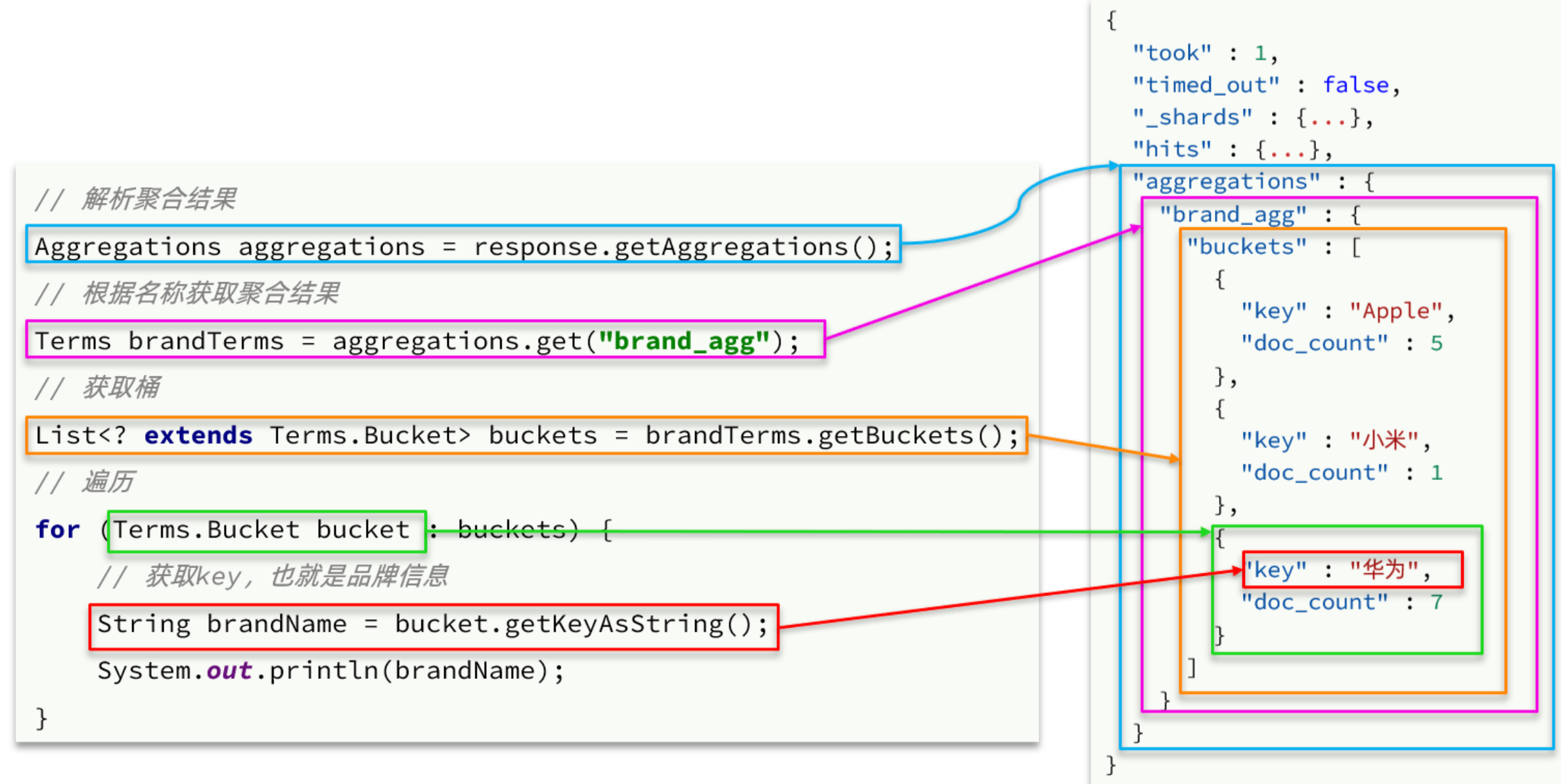 AggregationBuilders这个工具类来构造。DSL与JavaAPI的语法对比如下:聚合结果与搜索文档同一级别,因此需要单独获取和解析。具体解析语法如下: