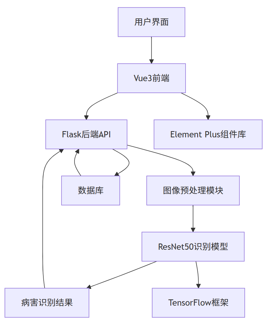 本系统采用前后端分离架构,前端使用 Vue3 框架结合 Element Plus 组件库构建,提供直观友好的用户界面,支持图片上传、病害识别、历史记录查询等功能。后端基于 Flask 框架开发,负责处理前端请求、图像预处理和模型推理。核心识别算法采用 TensorFlow 深度学习框架和 ResNet50 预训练模型,通过迁移学习和微调优化,实现了高准确率的病害识别。