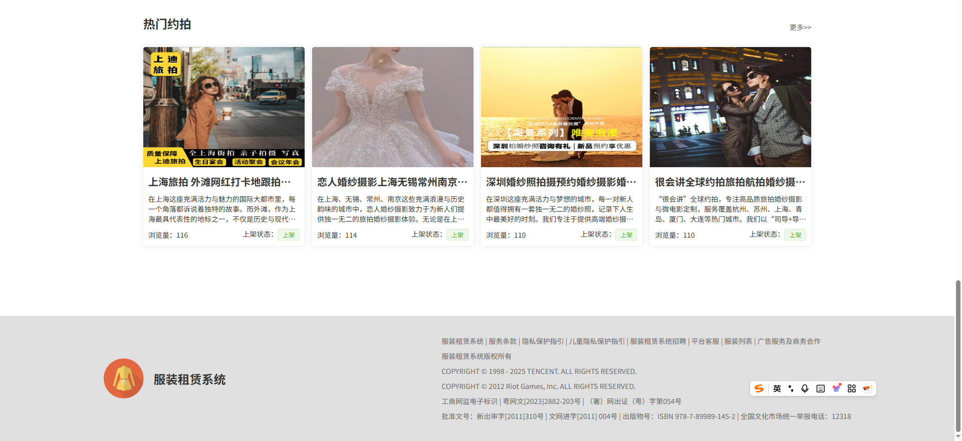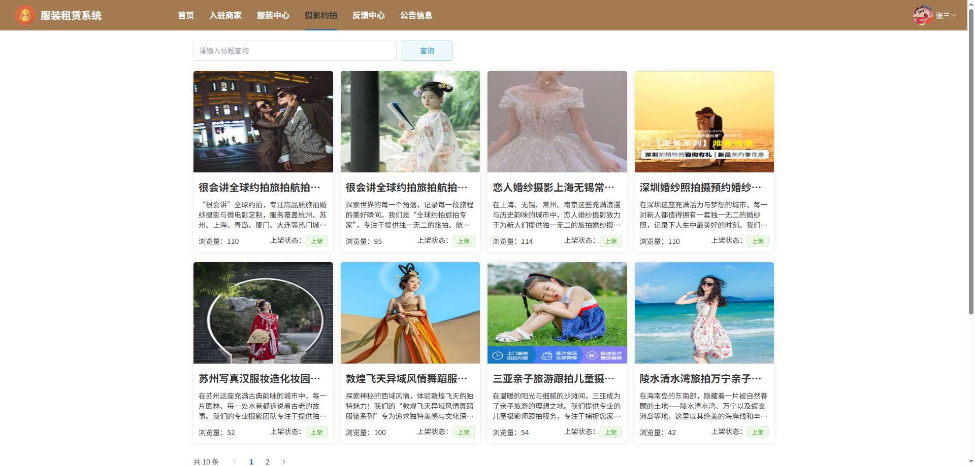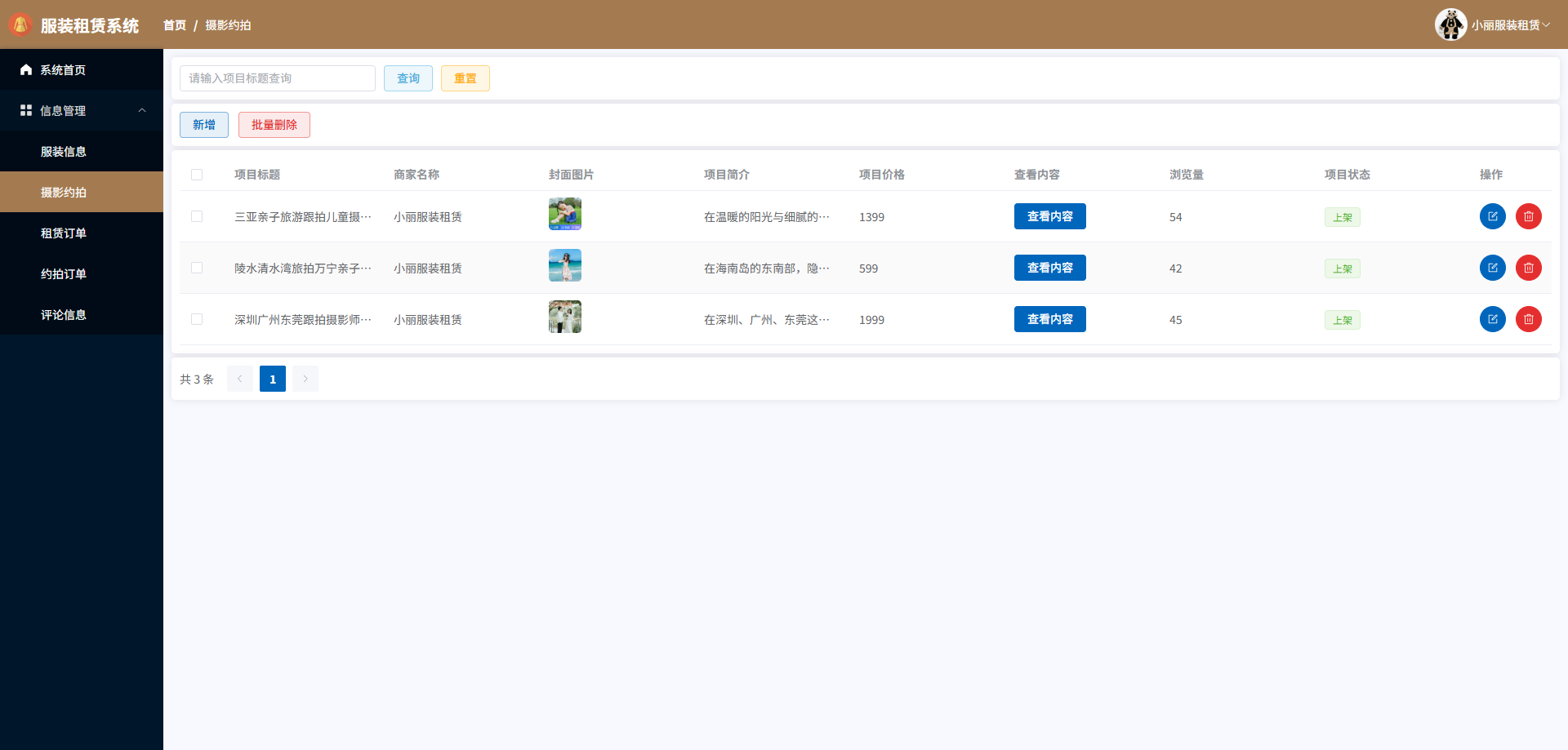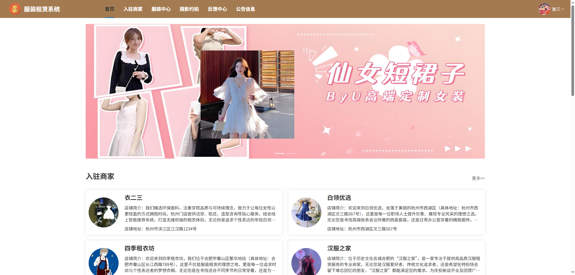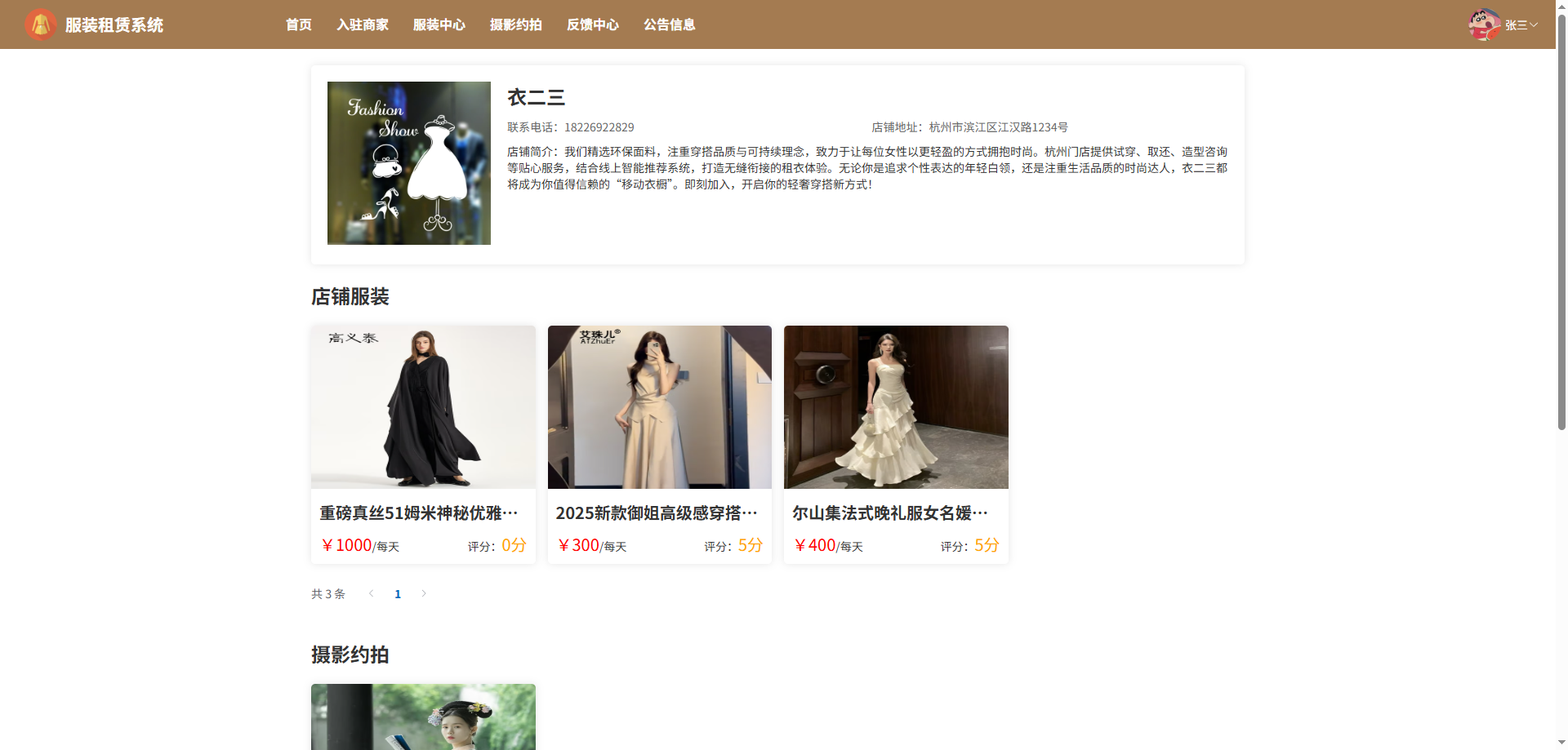 入驻商家:浏览所有认证通过的商家信息,商家有个人中心页面(展示商家信息和这个商家的服装信息和约拍信息)