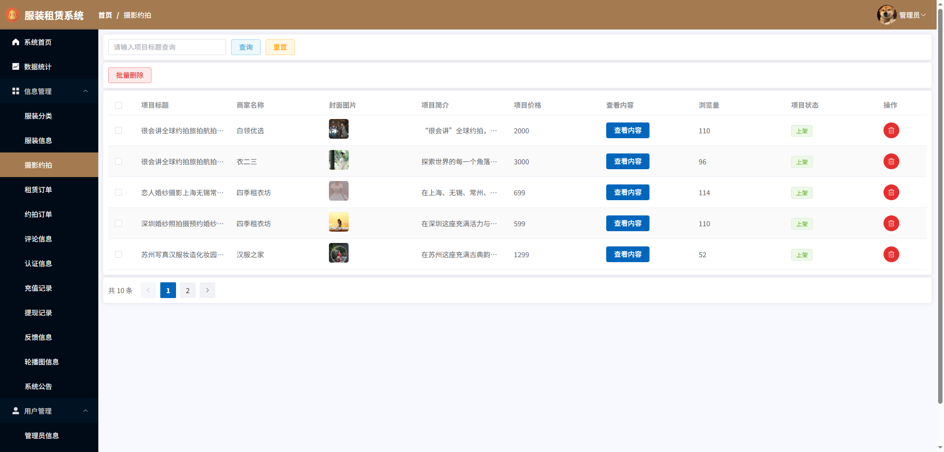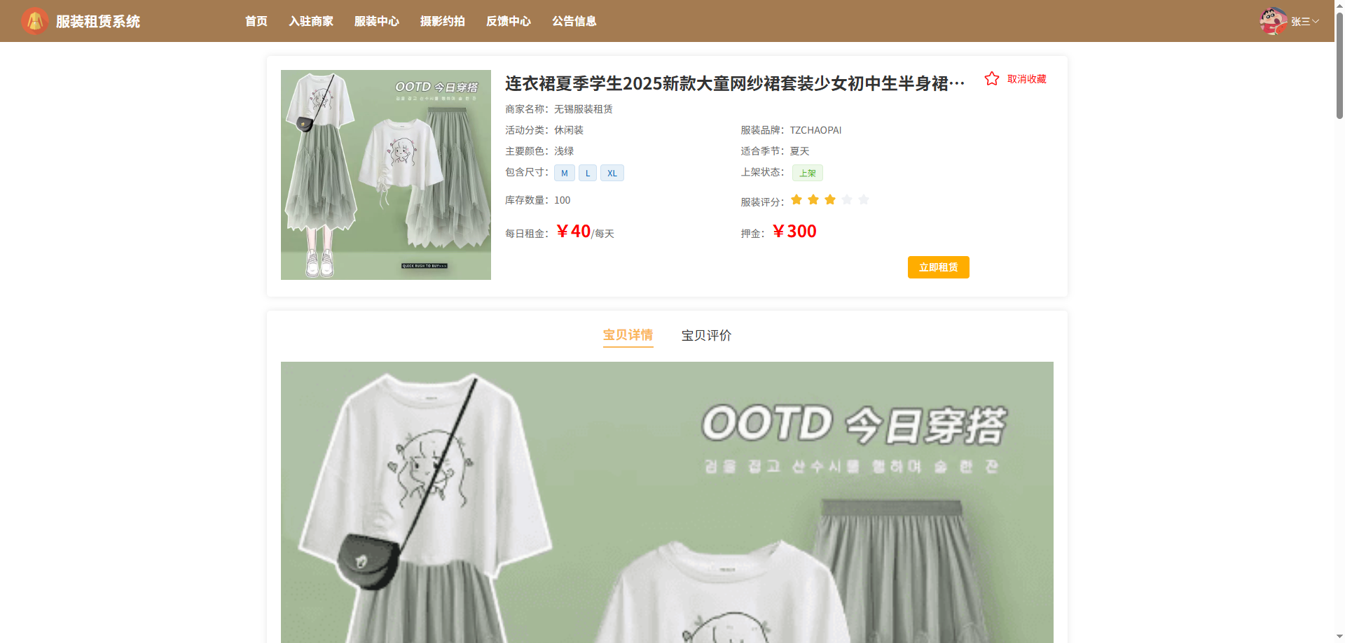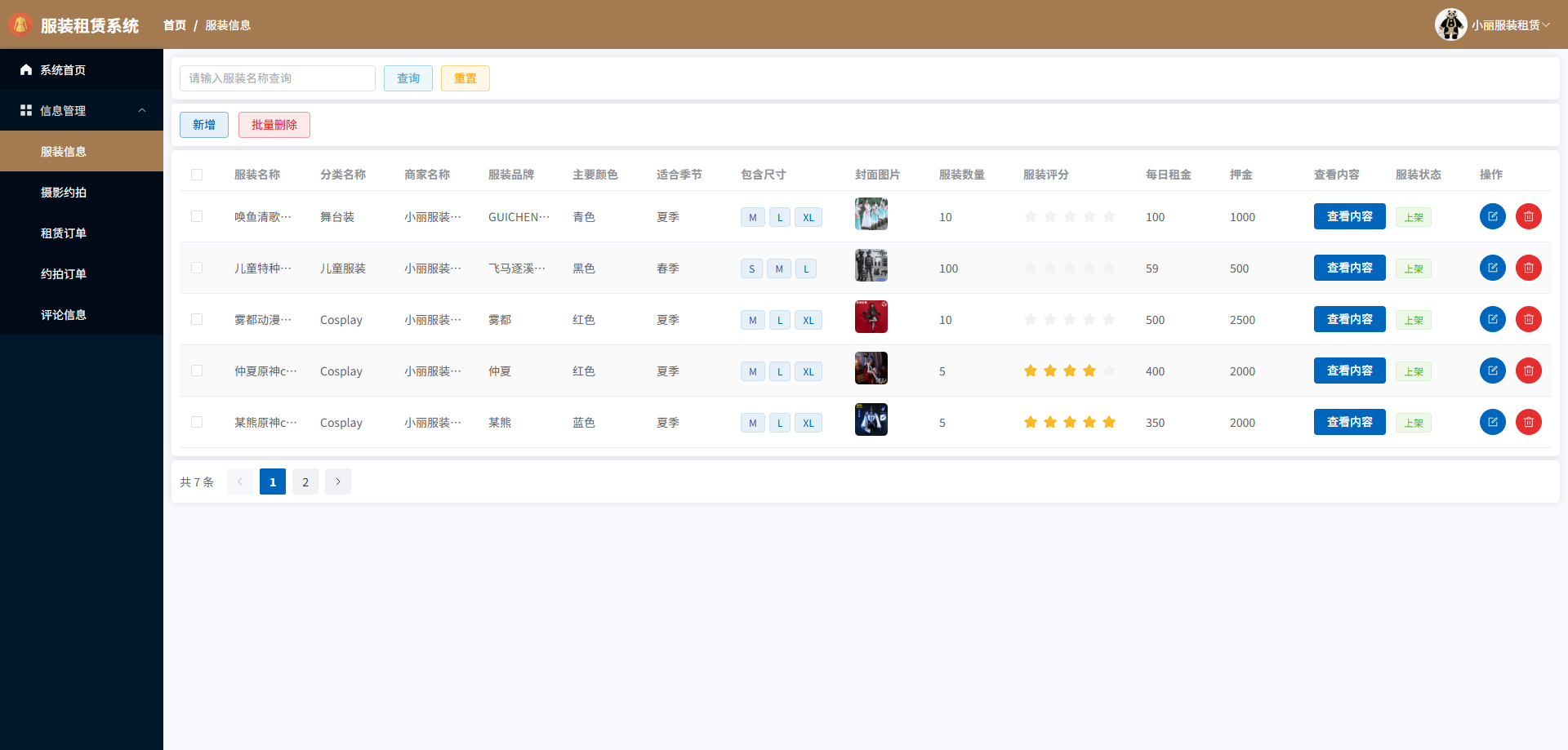 服装信息:管理当前登录商家的服装信息,有每日租赁费用和押金
