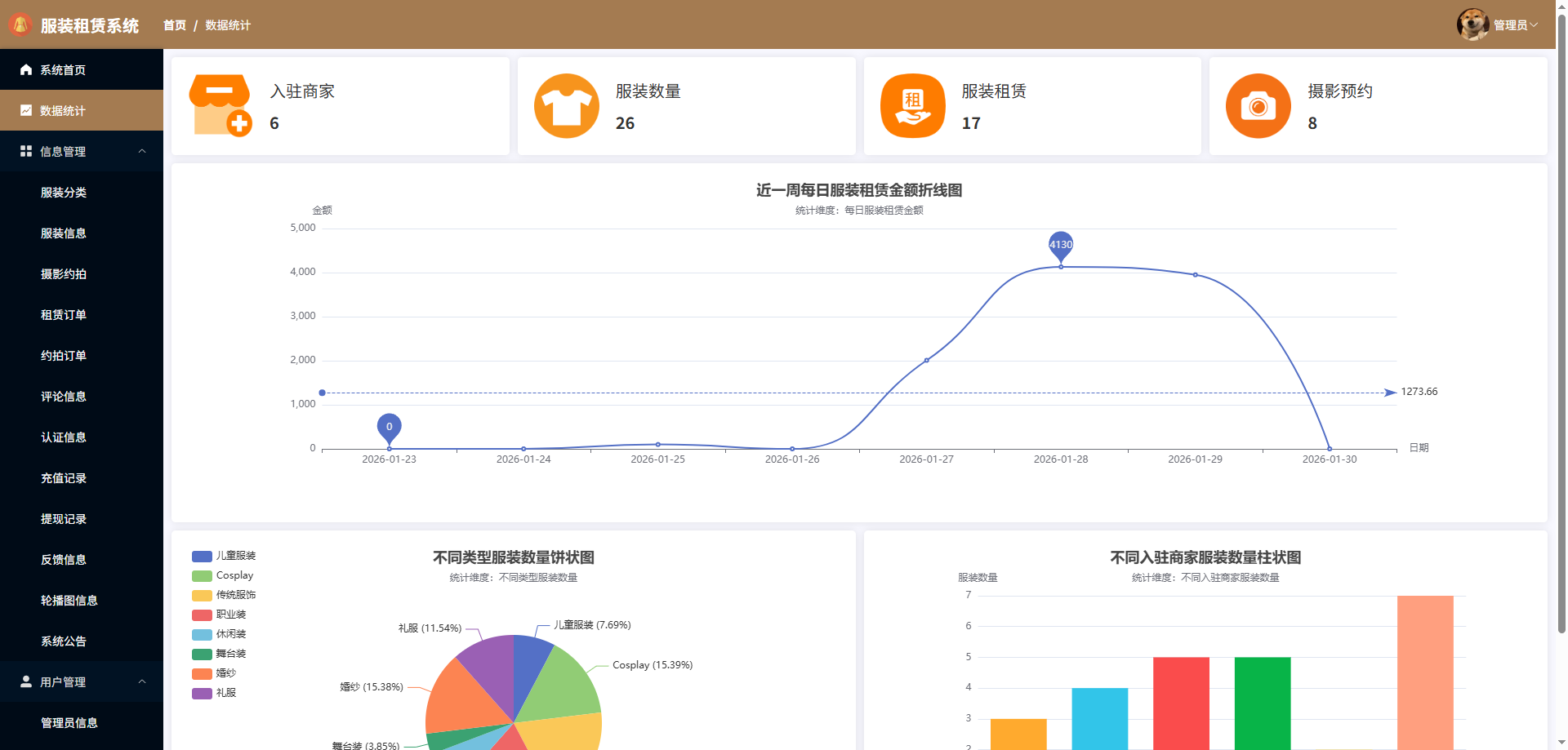 数据统计:统计近一周每日租赁金额折线图,统计不同类型服装数量饼图,统计不同入驻商家服装数量柱状图,入驻商家数量,服装数量,服装租赁数量,摄影预约数量