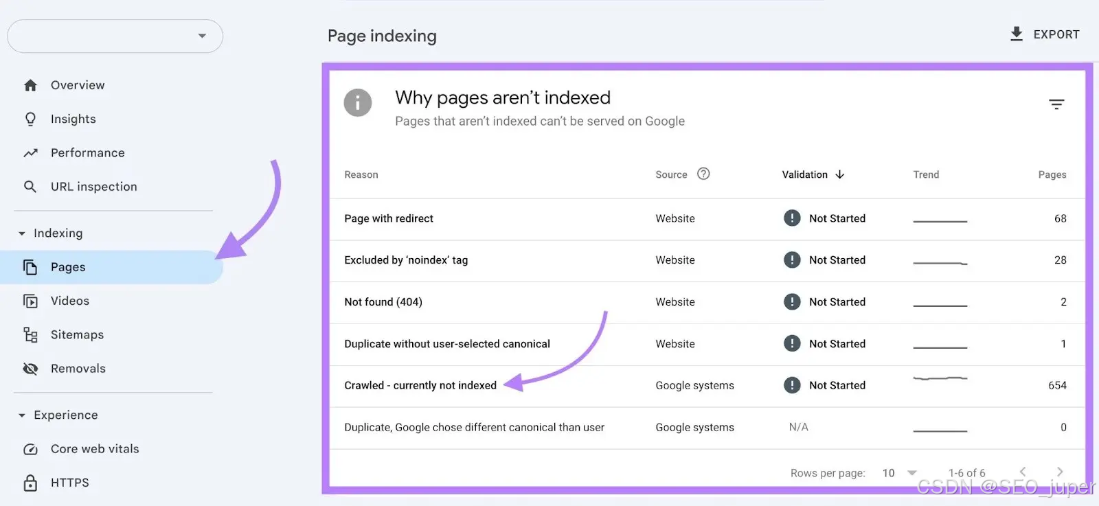 定位未索引原因 :查看"Pages"报告的" Why pages aren't indexed"板块,常见问题包括"页面重定向过多""被noindex标签排除""内容重复且未指定规范页(canonical)"。