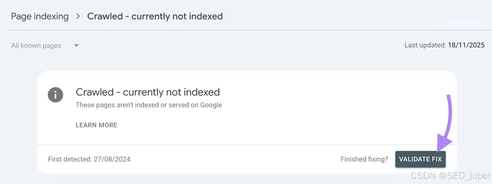 修复问题后,点击"验证修复"按钮,向谷歌提示受影响页面已准备好被索引。
