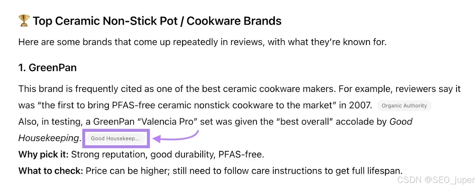 - 案例参考 :GreenPan(陶瓷厨具品牌)未直接与ChatGPT合作,但Good Housekeeping在其"2025年最佳陶瓷厨具"榜单中提及"GreenPan是首个推出PFAS-free陶瓷涂层的品牌",ChatGPT在回答"安全的陶瓷不粘锅品牌"时,直接引用了这一媒体提及,让GreenPan获得免费曝光。