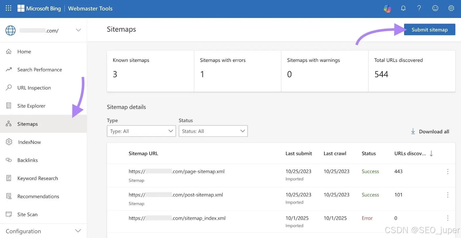 - 提交XML站点地图 :进入"Site Maps"板块,上传网站的sitemap.xml文件(如产品页sitemap、博客sitemap),帮助Bing快速发现页面。以某品牌为例,提交3个站点地图后,Bing共发现544个URL,其中443个产品页与101个博客页成功索引。