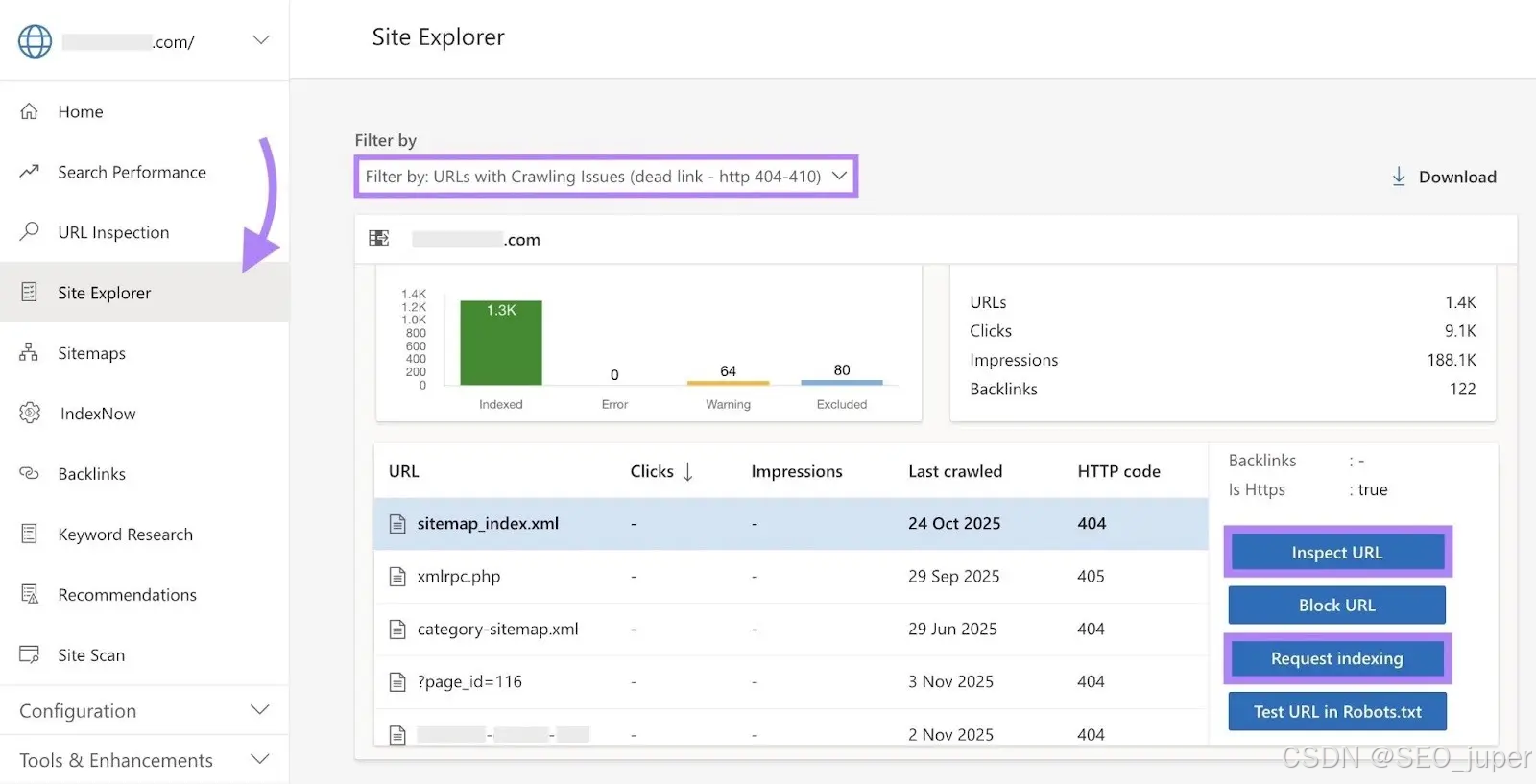 - 排查索引障碍 :通过"Site Explorer"的"Filter by"功能,筛选出存在问题的URL: