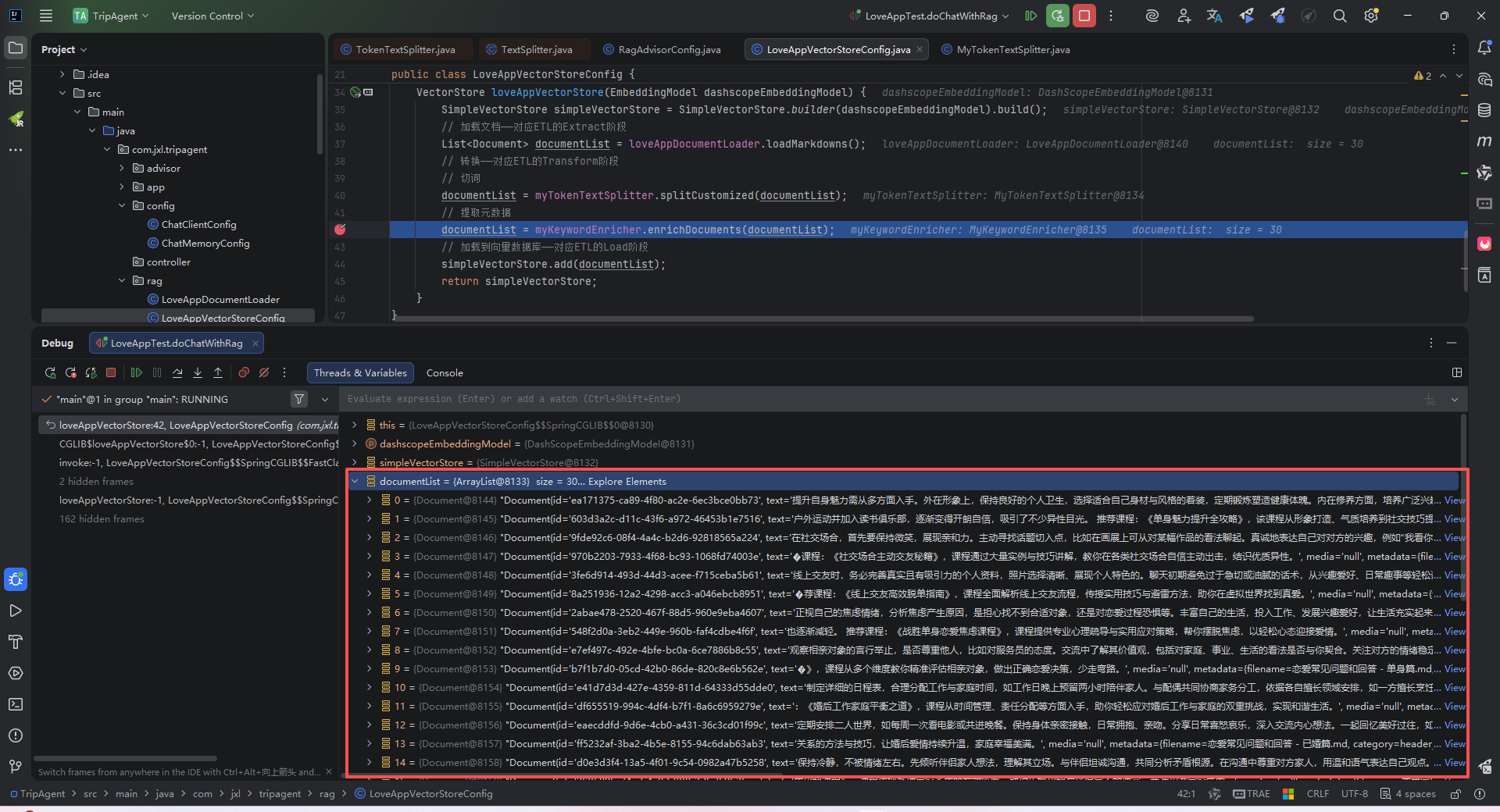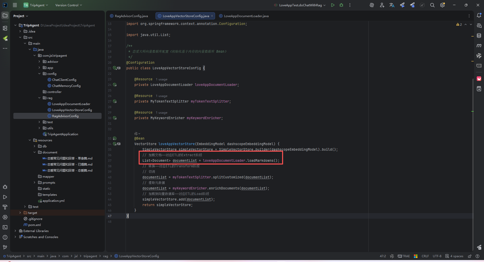 - 转换文档:根据需求将文档转换为适合后续处理的格式,比如去除冗余信息、分词、词性标注等,可以使用 DocumentTransformer 组件实现。