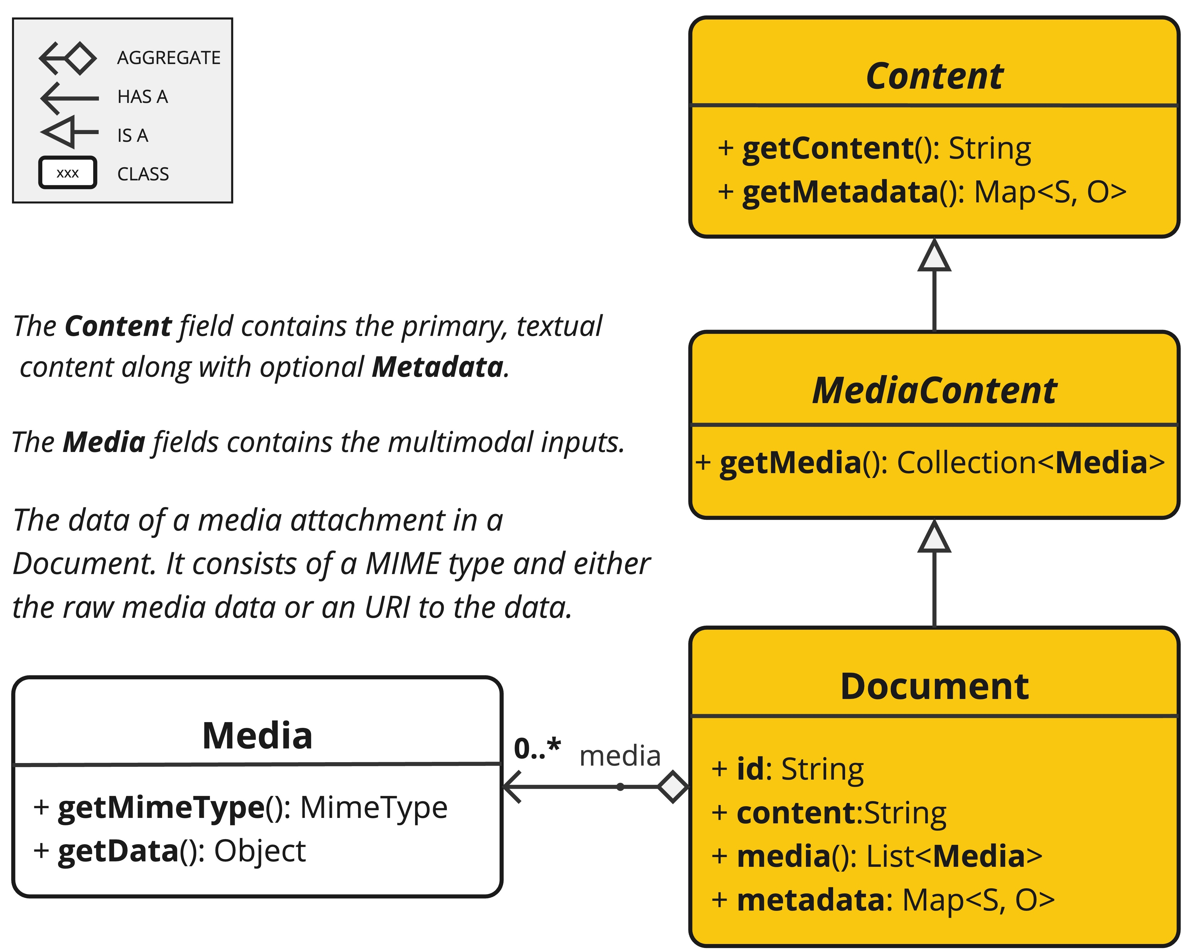 Spring AI 中的文档范围比我们生活中的更为广泛,不仅仅包含文本,还可以包含一系列元信息和多媒体附件(文档类包含文本、元数据以及可选的额外媒体类型,如图片、音频和视频。)