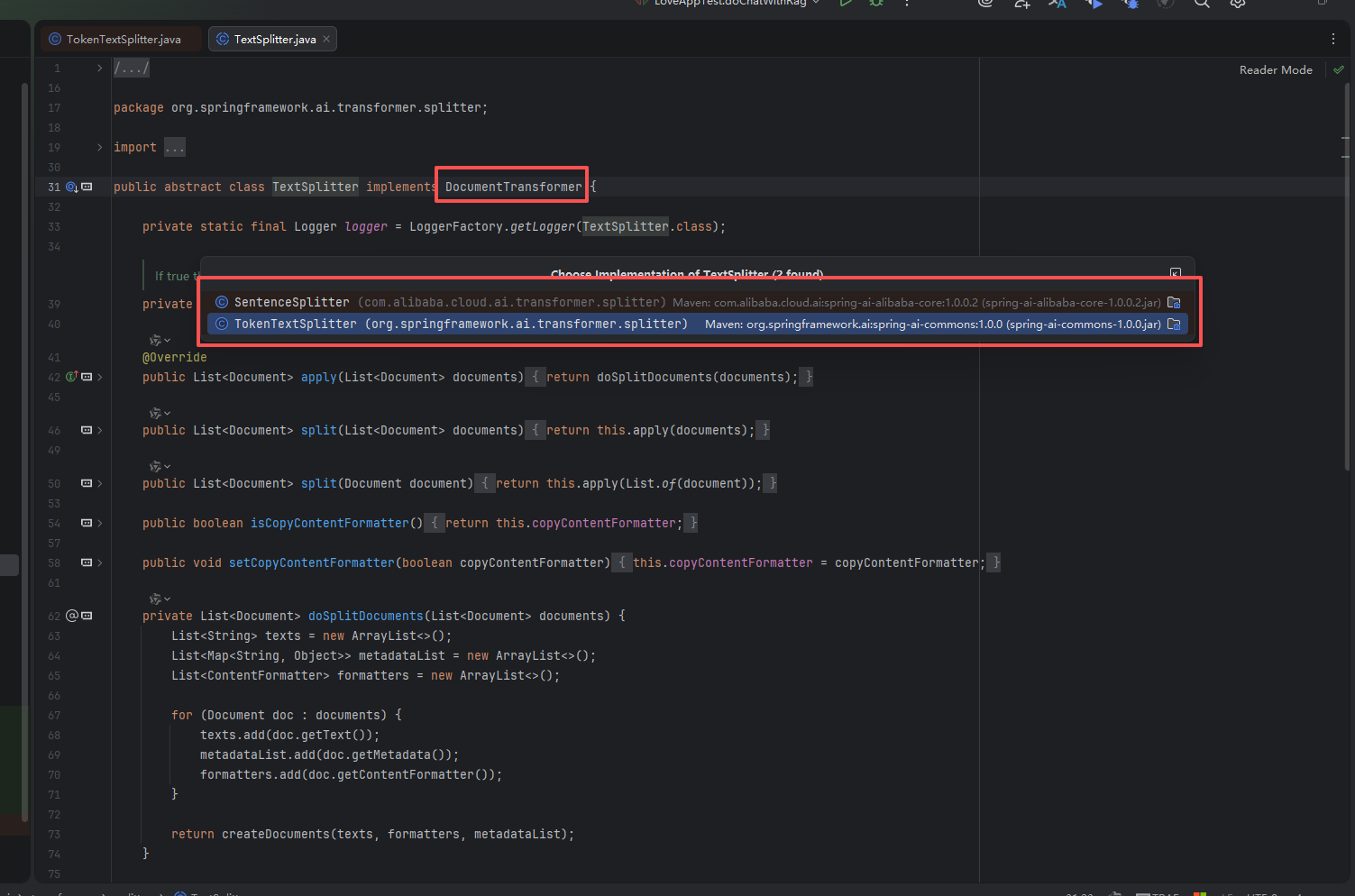 Spring AI 通过 DocumentTransformer 组件实现文档转换。看下源码,DocumentTransformer 接口实现了 Function<List<Document>, List<Document>> 接口,负责将一组文档转换为另一组文档。