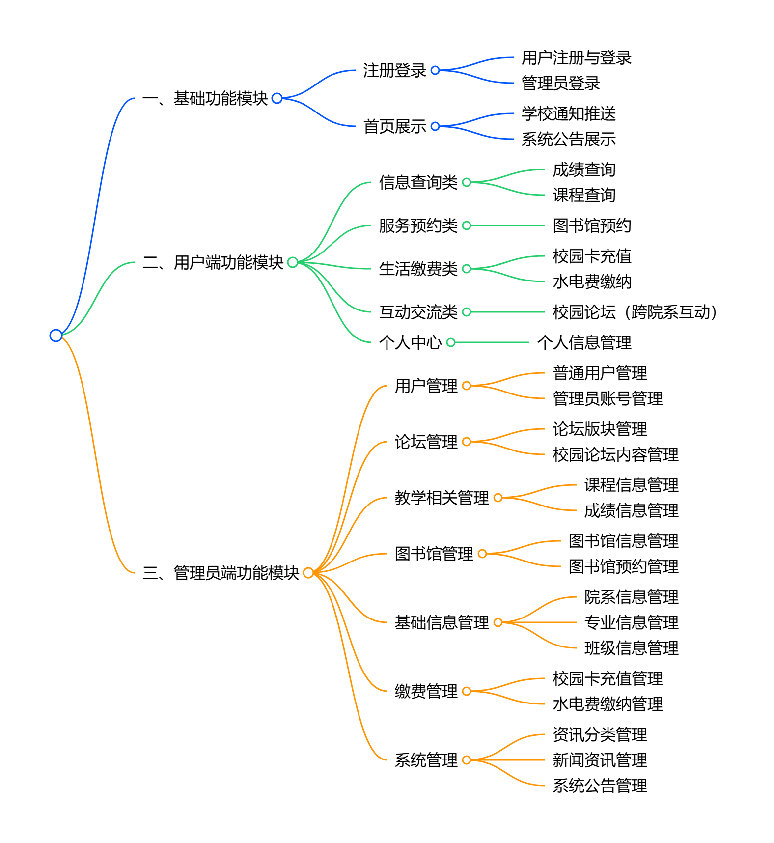 - 管理员端:可开展用户管理、管理员管理、论坛版块及内容管理、图书馆信息与预约管理、课程与成绩信息管理,维护院系、专业、班级等基础信息,处理校园卡充值与水电费缴纳相关管理事务,同时负责资讯分类、新闻资讯、系统公告等系统管理工作。