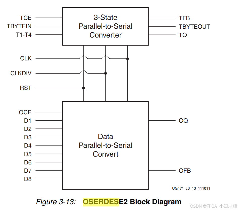 **TFB:**3-state Control Output-----此端口是 OSERDESE2 模块发送到架构的三态控制输出。它表示 OSERDESE2 处于三态。