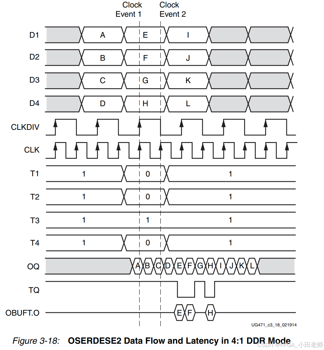 Clock Event1: T1、T2 和 T4 被拉低以释放三态条件。OSERDESE2 中 T1 - T4 和 D1 - D4 的串行化路径相同(包括延迟),这样在Clock Event1 期间,bit EFGH 总是与 T1 - T4 引脚上呈现的 0010 对齐。