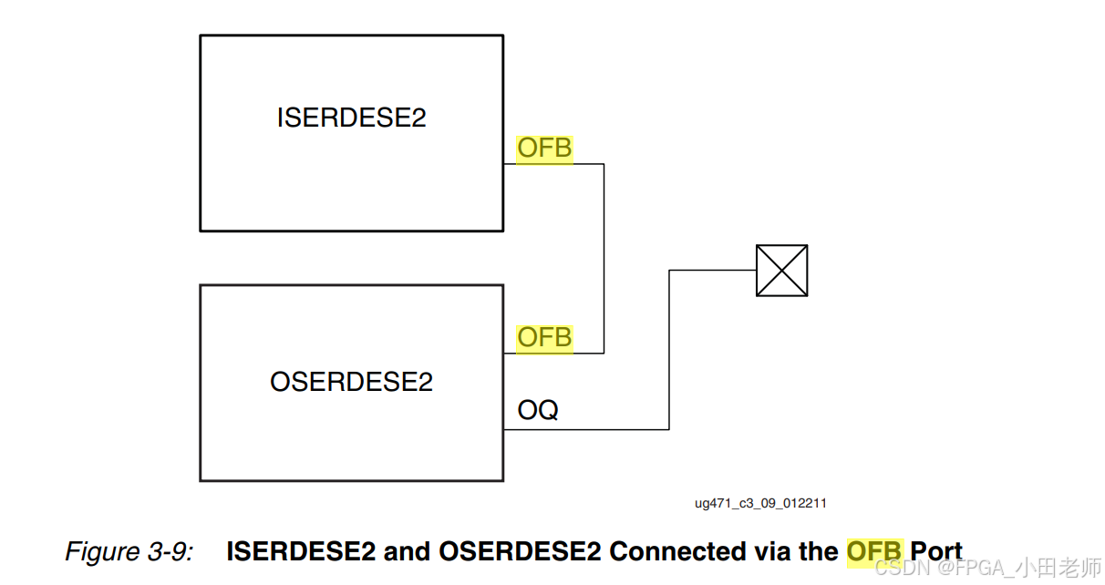 **OFB:**Output Feedback from OSERDESE2------输出反馈端口 (OFB) 是 OSERDESE2 的串行(高速)数据输出端口,用于与 ODELAYE2 原语配合使用,或者 OFB 端口可用于将串行数据发送到 ISERDESE2。