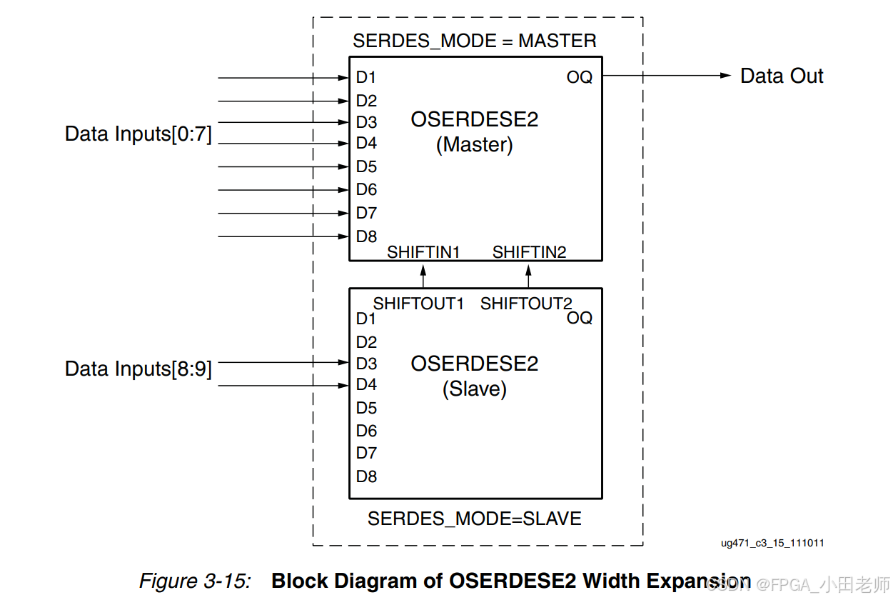 OSERDESE2模块可用于构建大于8:1的并串转换器。在每个I/O模块中,有两个OSERDESE2模块:一个主模块和一个从模块。通过将主OSERDESE2的SHIFTIN端口连接到从OSERDESE2的SHIFTOUT端口,该并串转换器可扩展至最高10:1和14:1(仅在DDR模式下)。对于差分输出,主OSERDESE2必须位于差分输出对的正(_P引脚)侧。当输出不是差分输出时,与从OSERDESE2关联的输出缓冲器不可用,且无法使用宽度扩展功能。