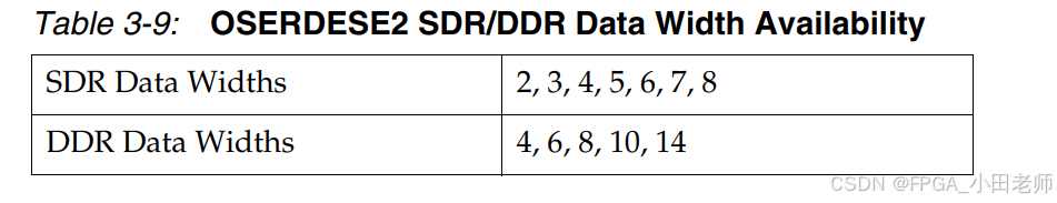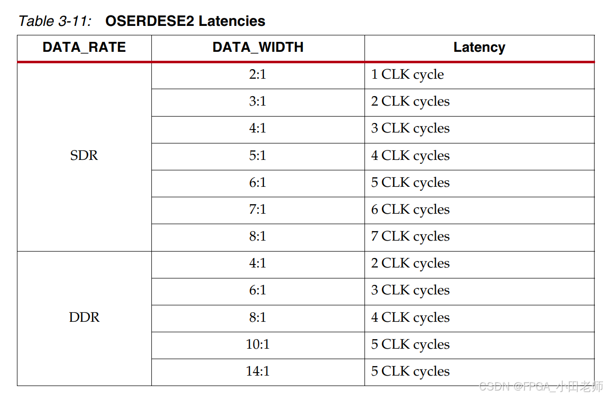 这种延迟与上表中列出的 2:1 SDR 模式 OSERDESE2 一个 CLK 周期的延迟一致。