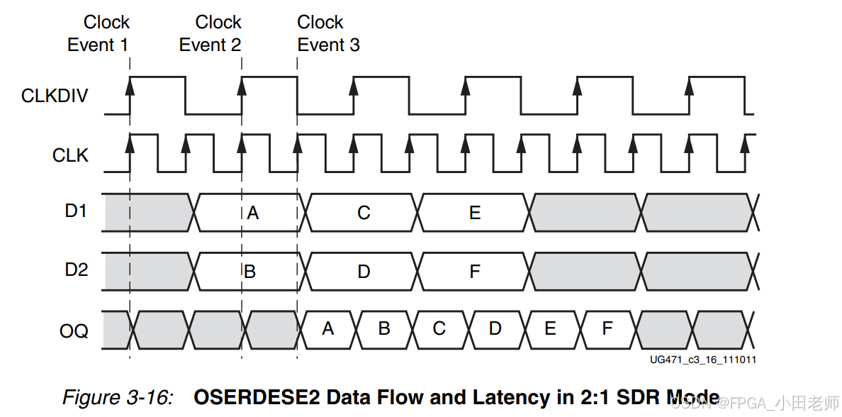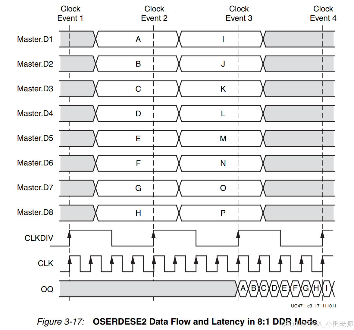 Clock Event3:时钟事件 3 在 ABCDEFGH 采样到 OSERDESE2 中之后的四个 CLK 周期,数据位 A 出现在 OQ 端。