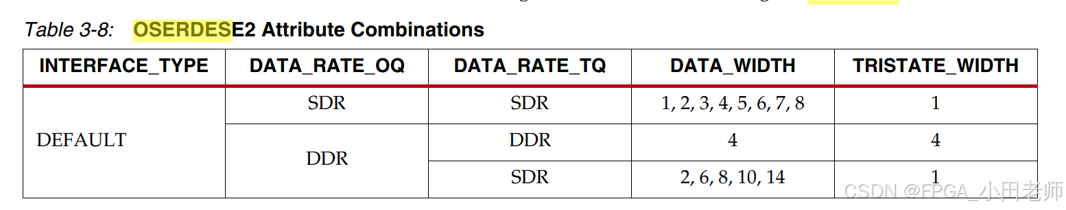 **DATA_RATE_TQ:**定义了三态控制是要作为单数据速率(SDR)还是双数据速率(DDR)来处理。此属性允许的值为SDR(上升沿变化)、DDR(双边沿变化)或BUF(只作为缓冲)。默认值为DDR。在SDR和DDR模式下,会使用四个T输入,并且可以使用TRISTATE_WIDTH属性来配置它们的行为。在BUF模式下,会绕过SDR和DDR模式寄存器,因此,应使用T1输入。施加到T1输入的信号与所有其他信号异步,因为它只是直接通过OSERDESE2。