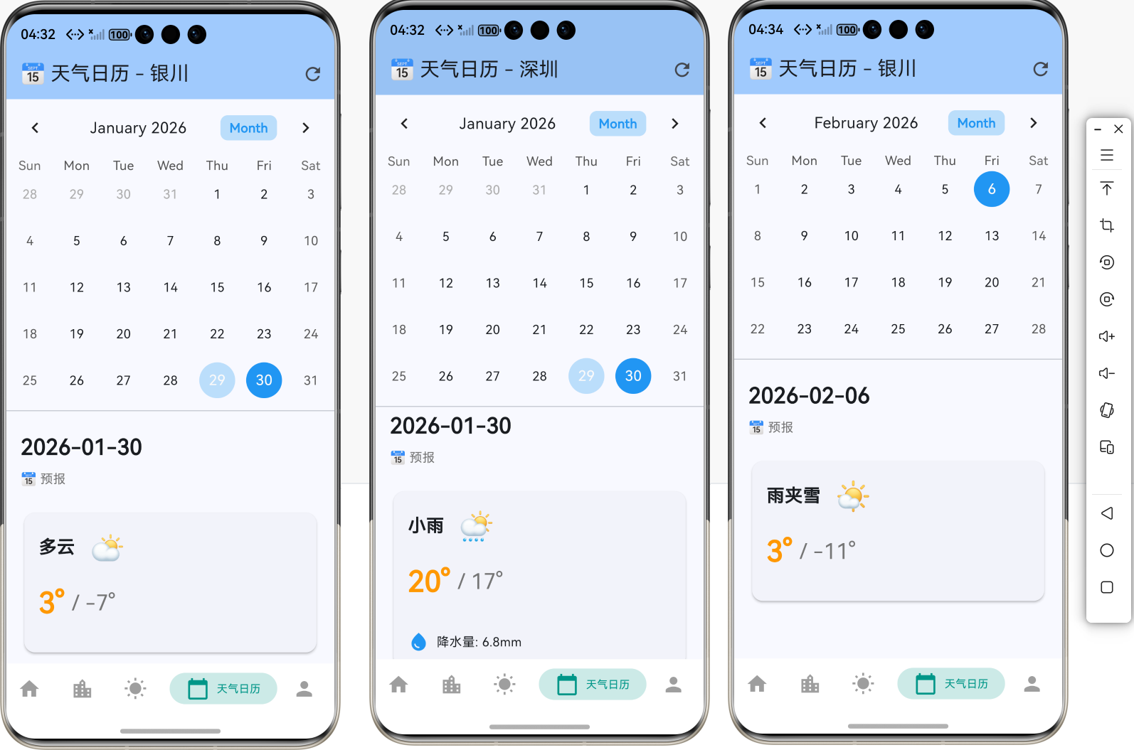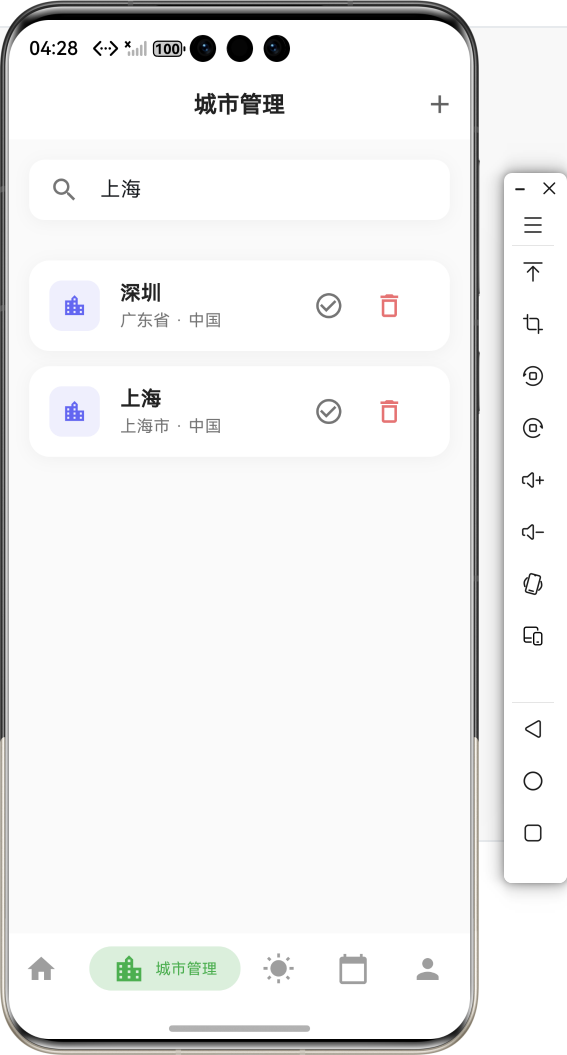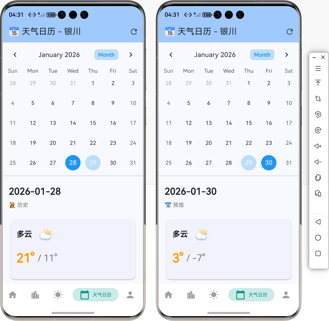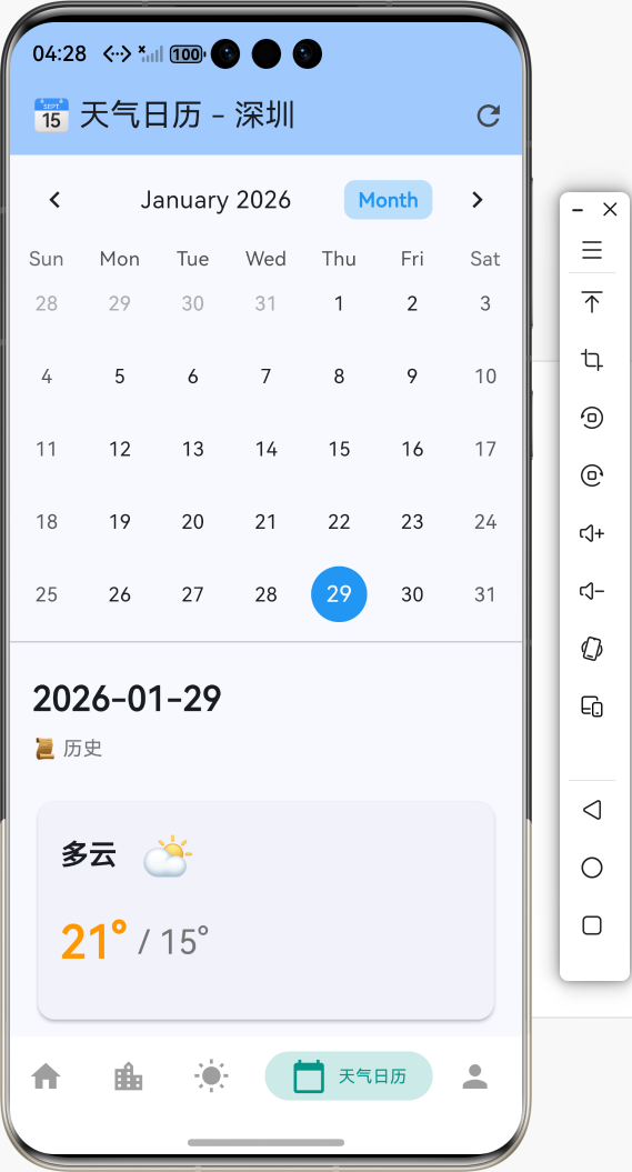 - 🌍 多城市支持:自动读取当前城市,支持切换城市查看不同地区的天气日历