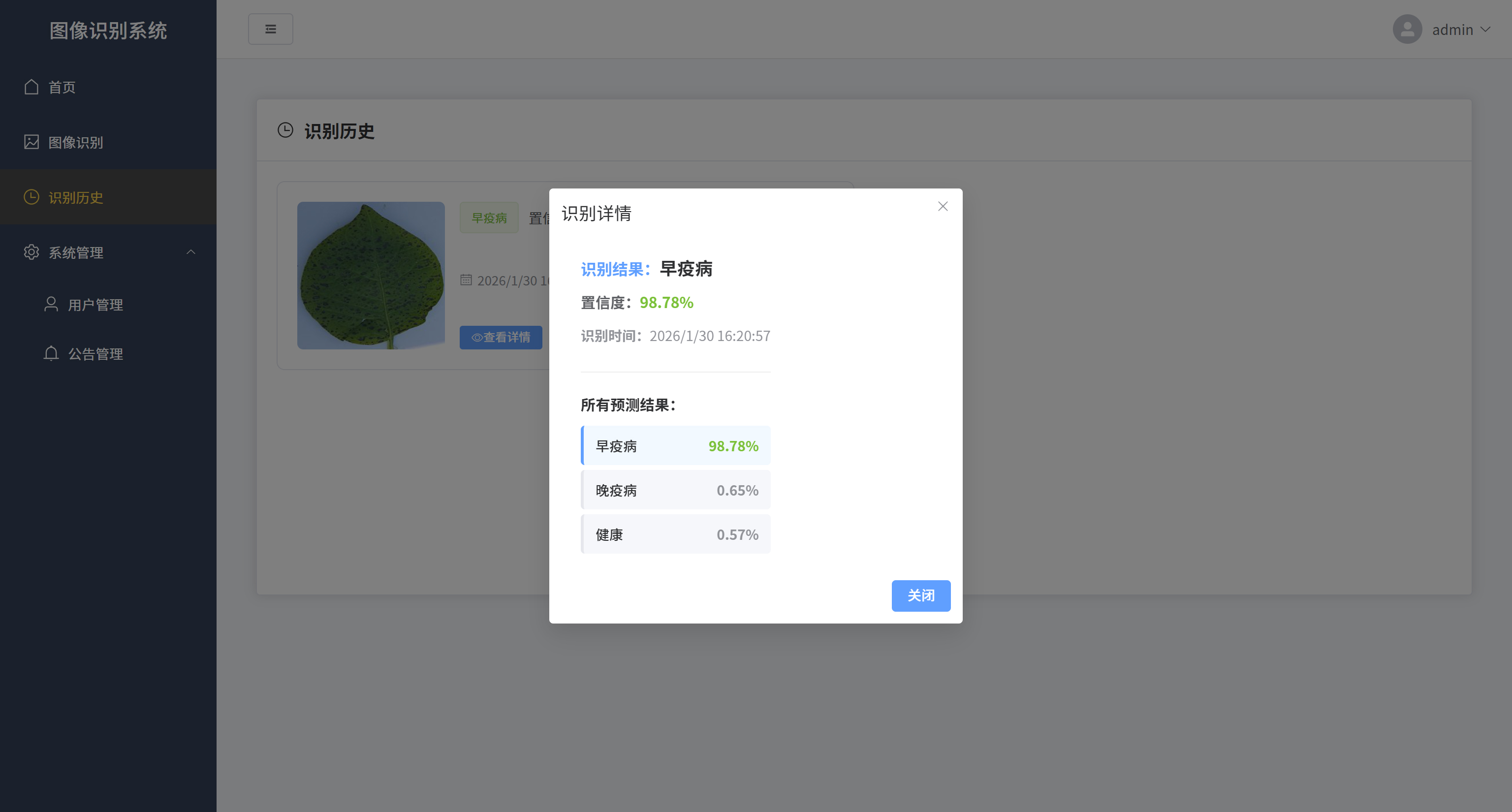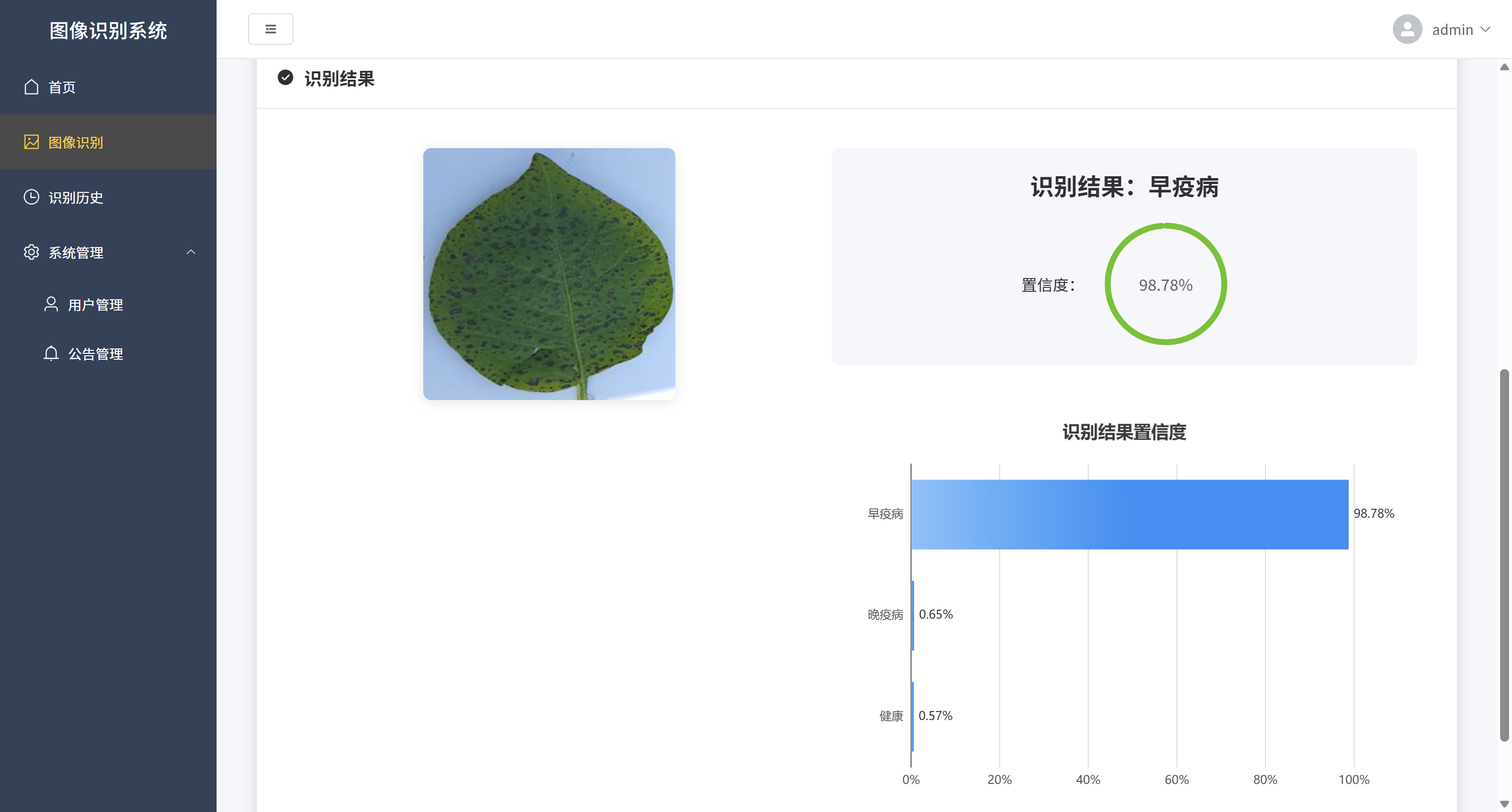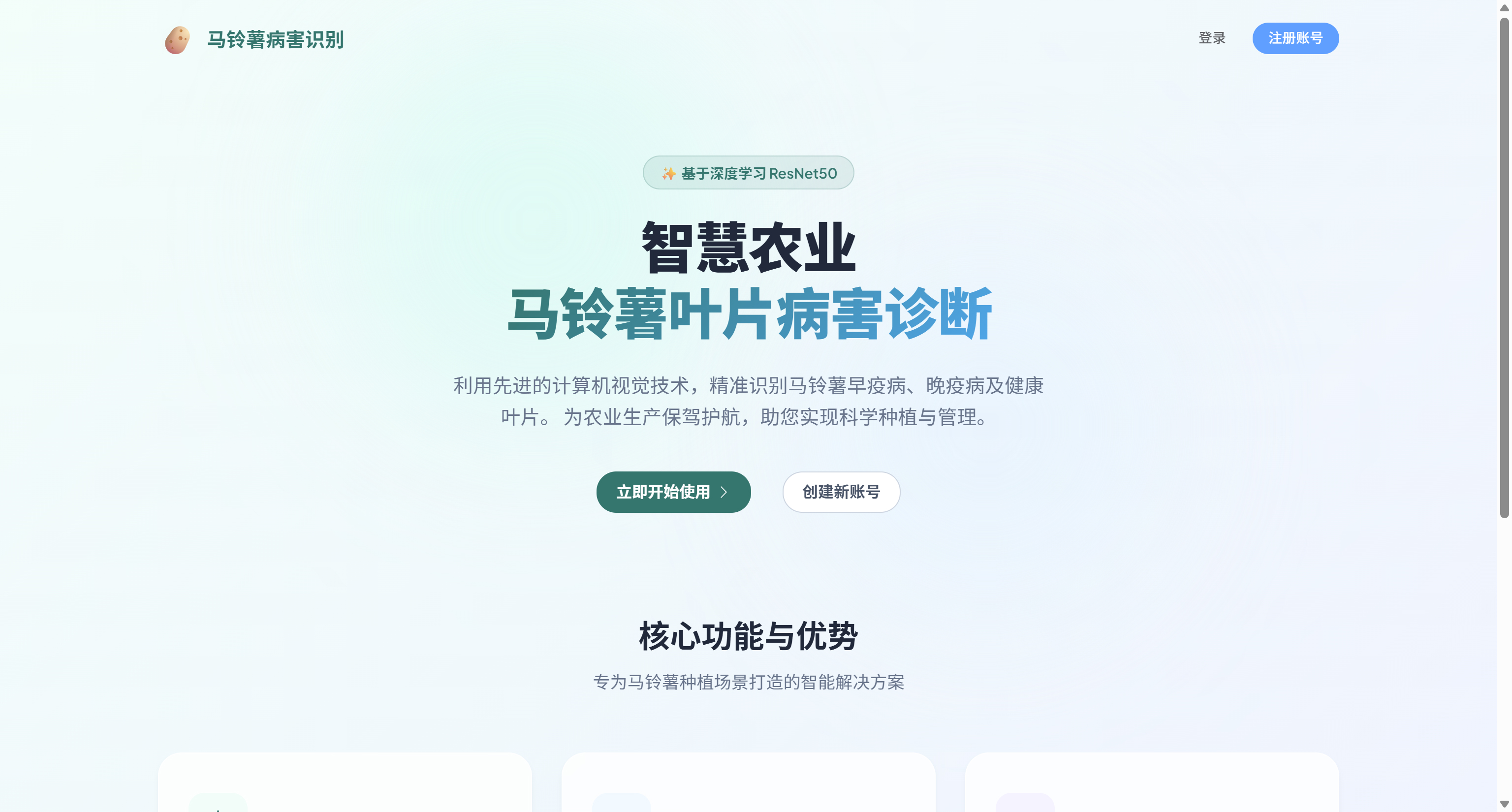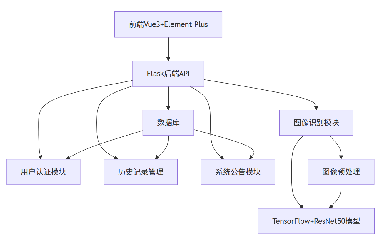 马铃薯叶片病害识别系统,是一款基于深度学习技术的智能农业辅助工具,帮助农民快速、准确地识别马铃薯叶片上的常见病害。系统采用前后端分离架构,前端使用Vue3+Element Plus构建直观易用的用户界面,后端基于Flask框架提供稳定的API服务,核心识别算法则采用TensorFlow框架和ResNet50深度卷积神经网络模型。