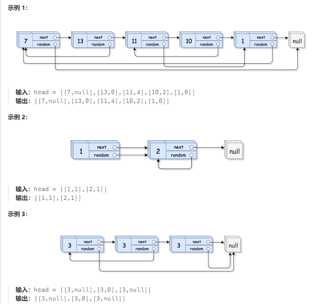 但这道题多了一个 random 指针,它可能指向链表中的任何一个节点(可以是它自己,或者它前面的节点)。