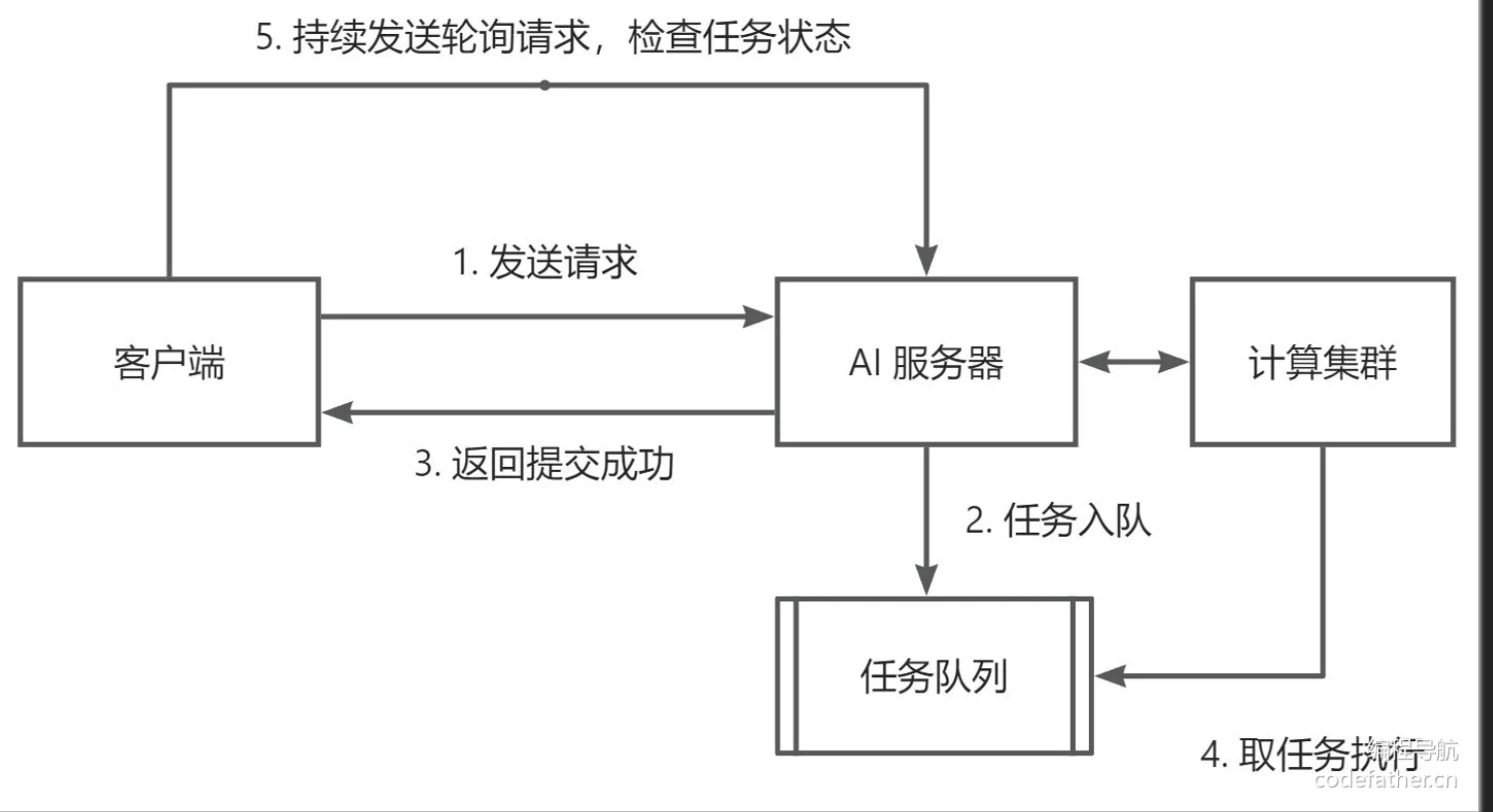 异步调用流程如下,客户端需要在提交任务后,不断轮询请求,来检查任务是否执行完成: