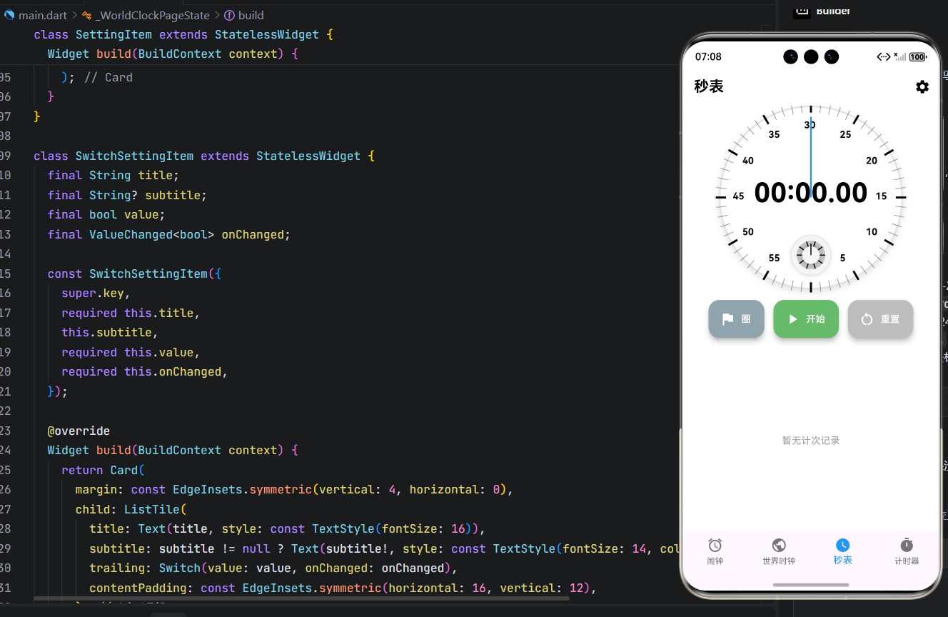 - 状态保持:用户在秒表页面开始计时后,切换到闹钟再返回,秒表继续运行;