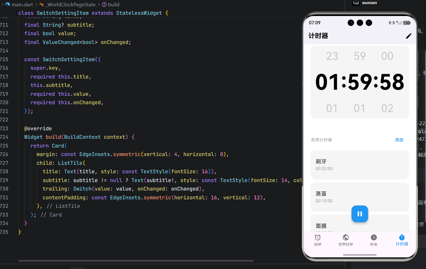 本文将以一个真实项目为例,详细讲解 如何使用 Flutter 开发这四大模块,并将其无缝集成到一个统一的时钟应用中,最终部署运行于 OpenHarmony 设备 。我们将重点剖析 模块融合架构、状态管理、深色模式适配、性能优化 等关键工程实践,并探讨 Flutter 在 OpenHarmony 生态中的定位与优势。
