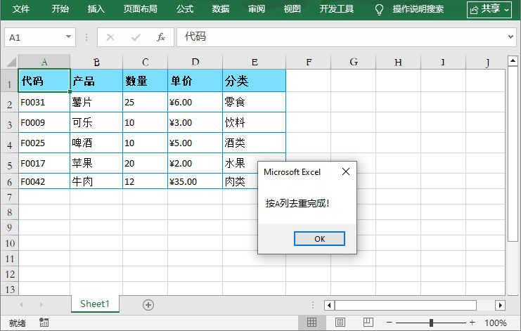 F5运行,或点击 "运行" 按钮; - 回到 Excel,弹窗提示 "按A列去重完成"。