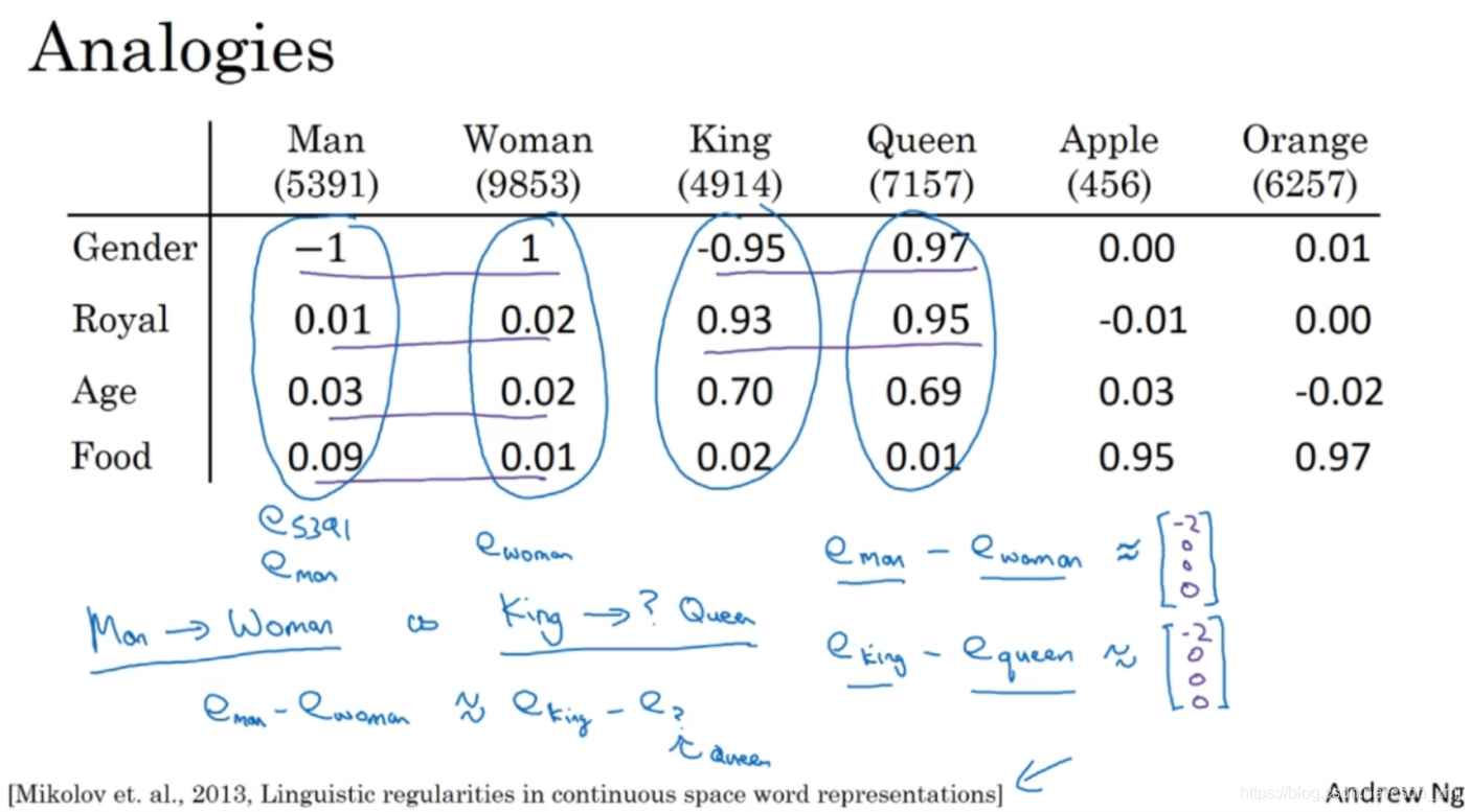 - 对于上图这些词:<1>比如第一个特征是性别(Gender)。假定男性的性别为-1,女性的性别为+1,那么man的性别值可能就是-1,而woman就+1。最终根据经验king就是-0.95,queen是+0.97,apple和orange没有性别可言。