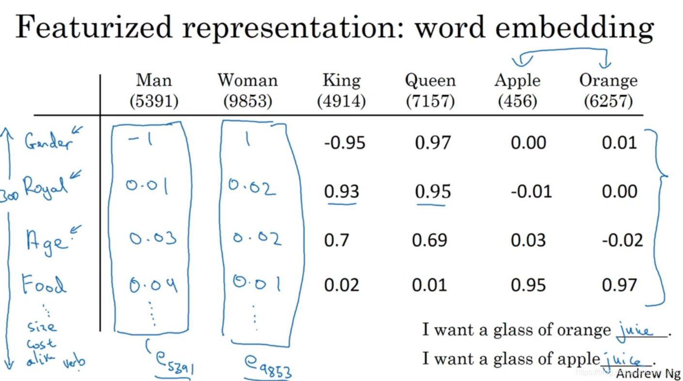 - 所以我们换一种表示方式,用一种特征化的表示方式 :词嵌入。