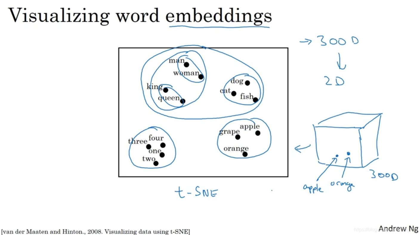 - 如上图,观察这种词嵌入的表示方法,我们看到man和woman这些词聚集在一块,king和queen聚集在一块,表示人的单词也都聚集在一起。动物都聚集在一起,水果也都聚集在一起,像1、2、3、4这些数字也聚集在一起。如果把这些生物看成一个整体,他们也聚集在一起。
