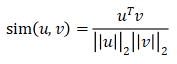 - 如下图,一个常用的相似度函数:余弦相似度函数,假设在向量u和v中定义相似度:分子是u和v的内积,u的转置乘以v,如果u和v非常相似,那么它们的内积将会很大。分母是u和v的欧氏距离。