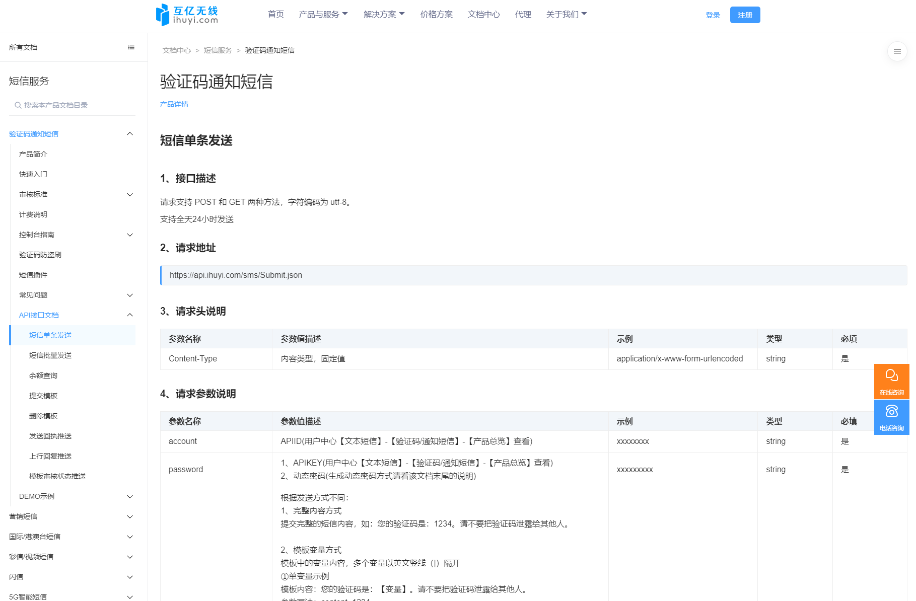 - 请求地址:短信接口的HTTPS地址(如https://api.ihuyi.com/sms/Submit.json);