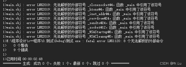 如果在使用套接字API函数,报出下面的错误,则表示没有引入套接字的静态库