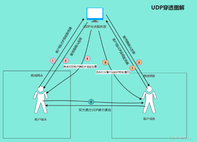 UDP穿透的原理就是,我们让两个局域网内的设备通过UDP连接到我们固定不变的公网IP服务器上,然后互相告诉对方的IP地址,之后两个设备就可以通过UDP进行互相通信