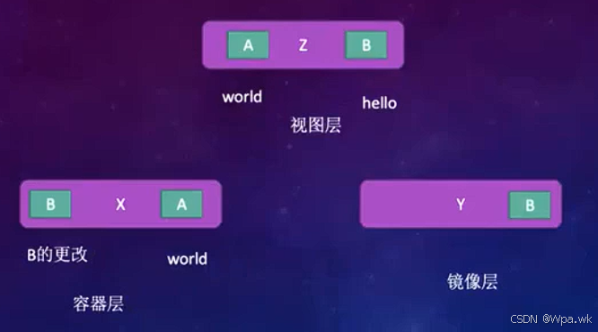 2.在视图层修改镜像层东西,会在容器层中保存对某个镜像操作的记录,不会真的在镜像中体现;(如:B更改xx)