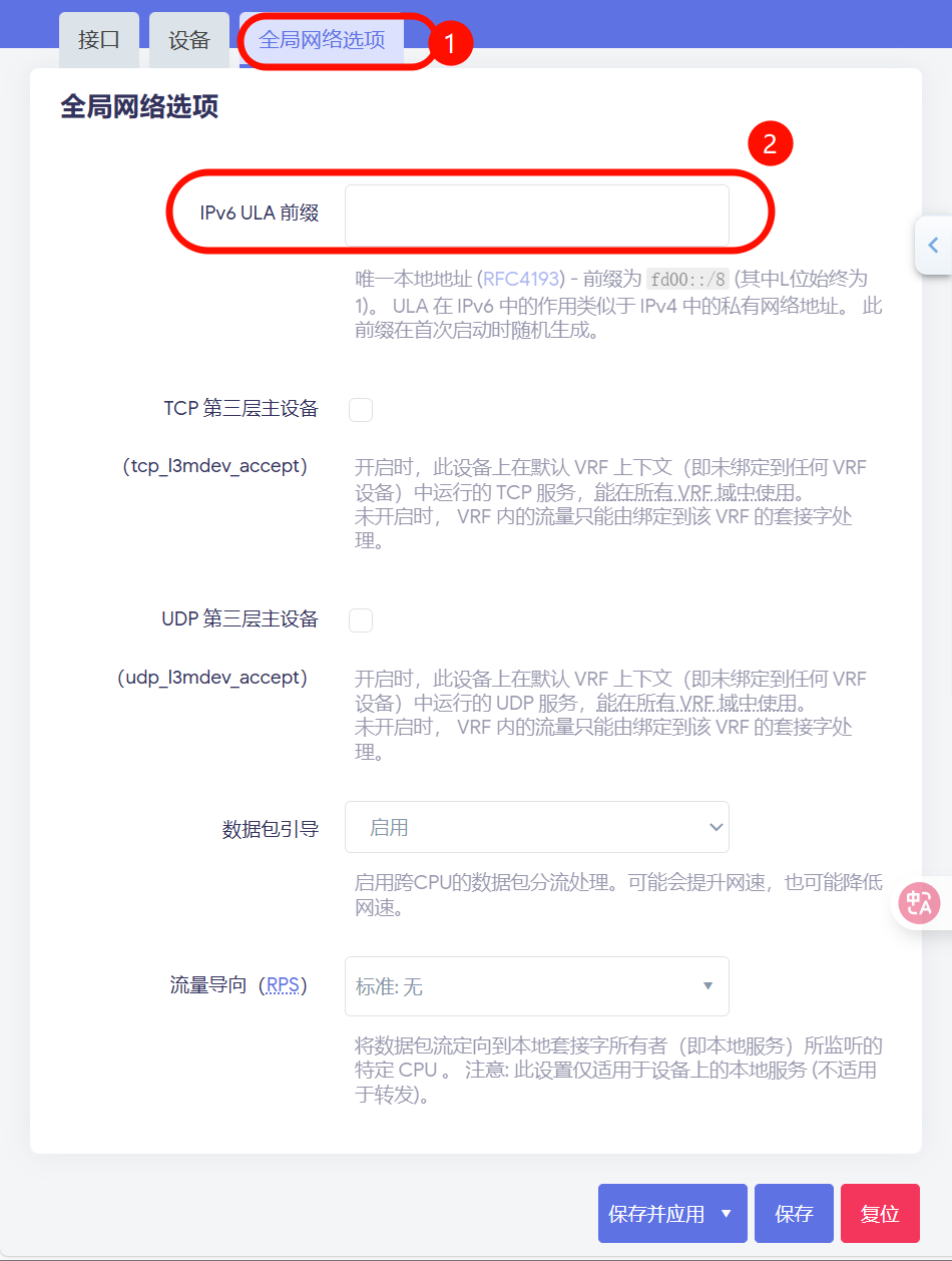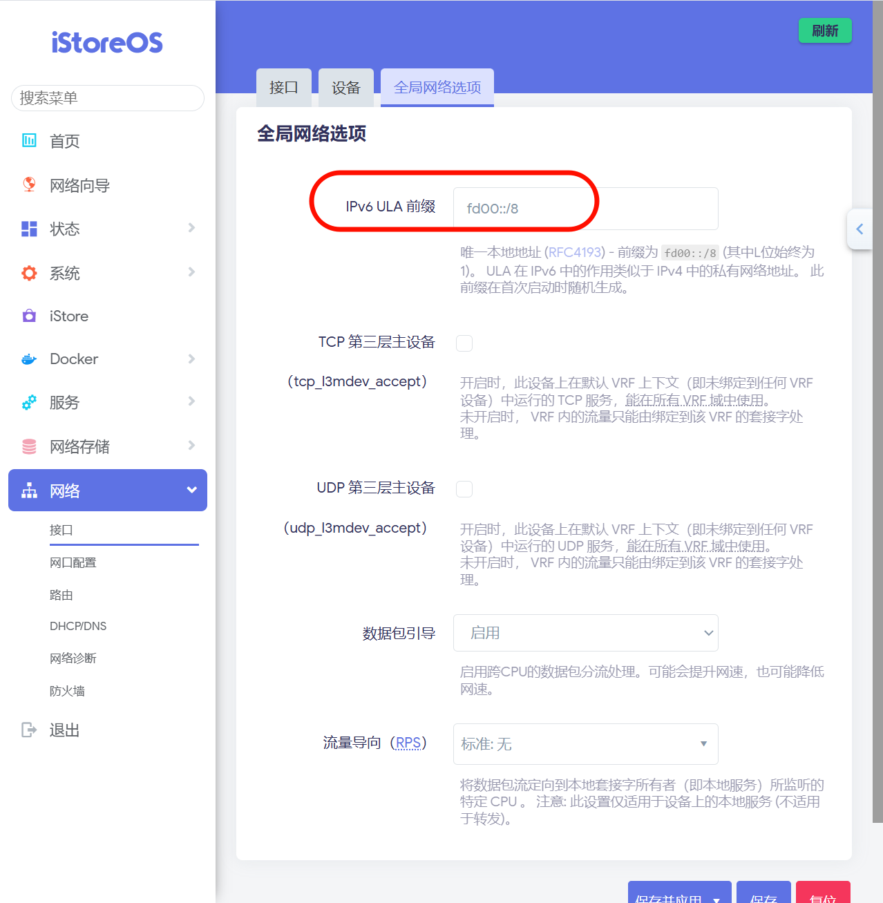 全局网络选项中删除自动生成的 ULA 前缀(fdd5:...),防止其干扰公网地址分配。
