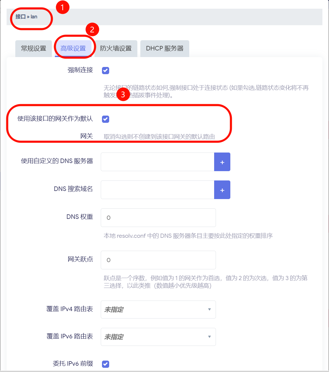 返回 iStoreOS/OpenWrt LAN 口 DHCPv6 设置,找到并勾选 "始终通告默认路由" 选项。如下图: