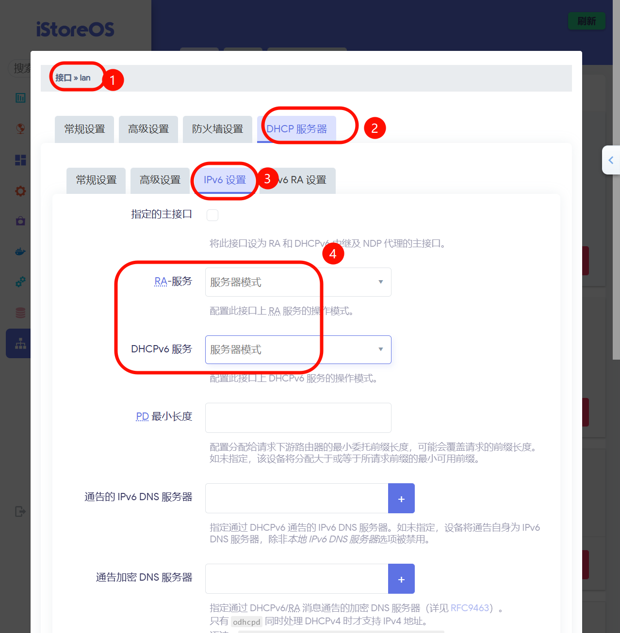 在光猫拨号并已启用 IPv6 的网络中,光猫本身是 IPv6 的路由通告(RA) 和 DHCPv6 服务器 。iStoreOS/OpenWrt 作为二级路由,其正确的角色应是一个 "透明中继" ,负责将光猫下发的 IPv6 信息原样转发给内网设备,而非自己充当服务器。默认的 iStoreOS/OpenWrt 配置(LAN 口为"服务器模式")会尝试自行分配 IPv6,导致与上层冲突,使终端设备无法获得有效的公网 IPv6 地址或路由。