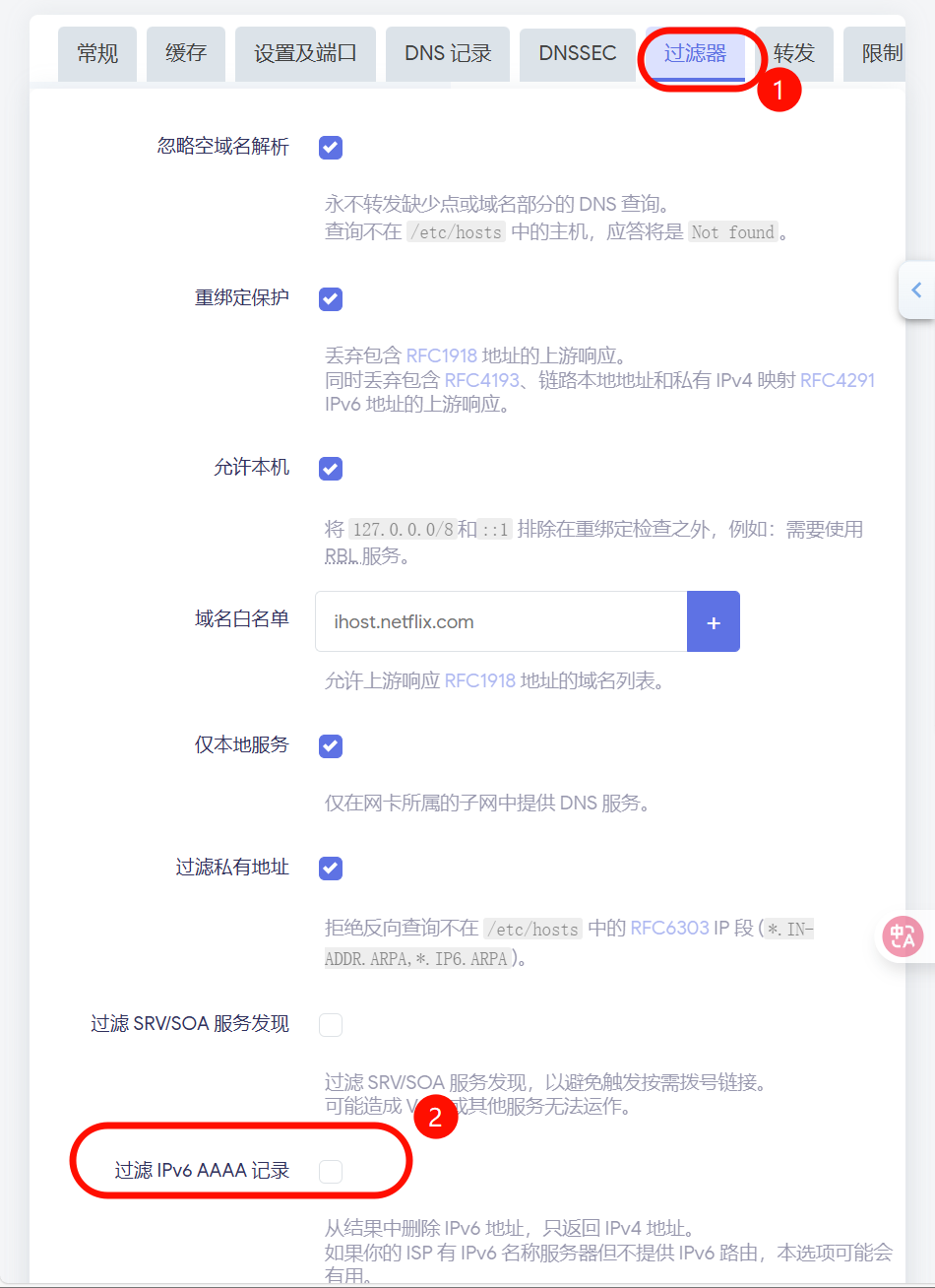 DHCP/DNS高级设置中,取消勾选 "过滤 IPv6 AAAA 记录"。