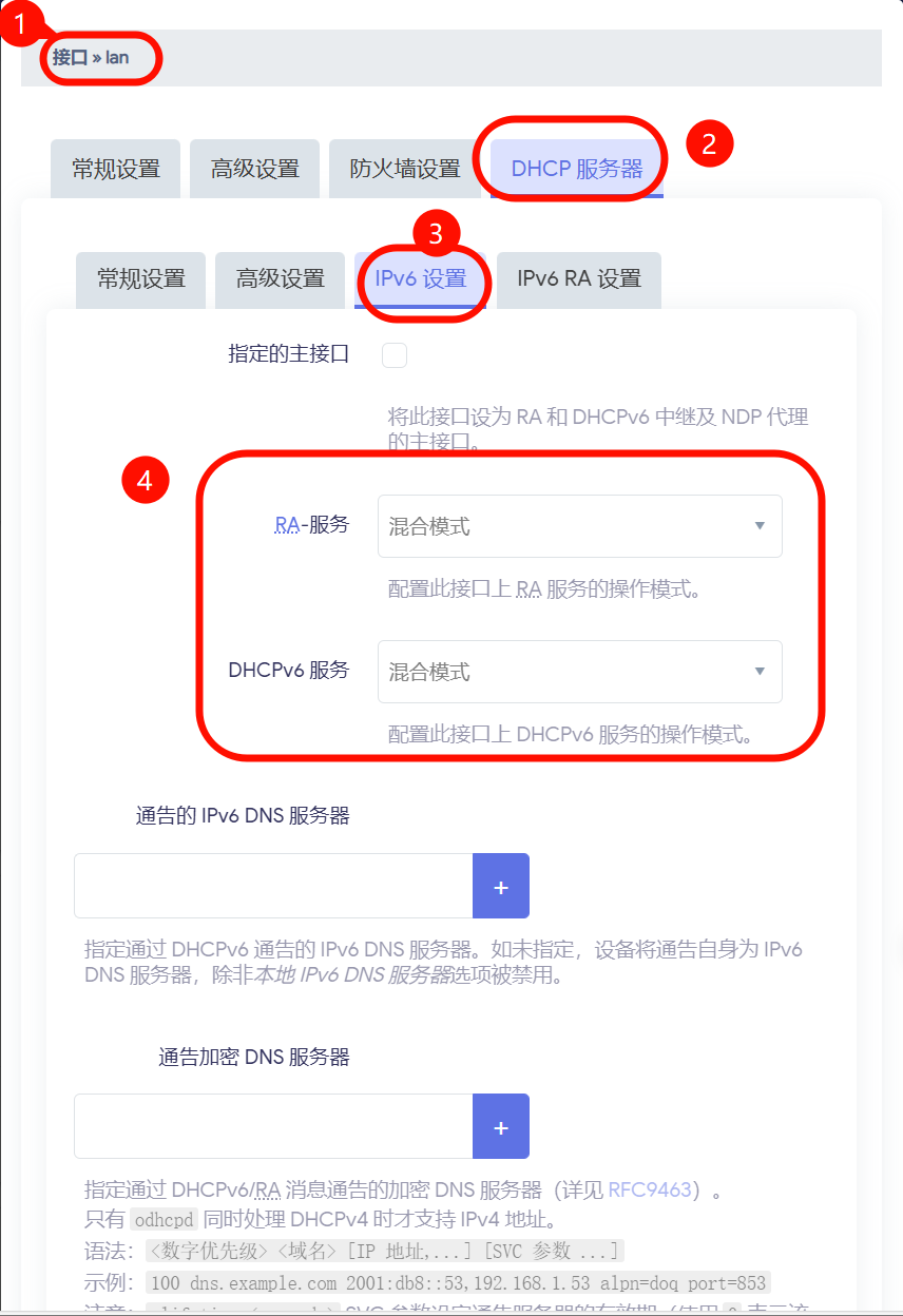 | 网络 -> 接口 -> LAN -> DHCP服务器 -> IPv6设置 | 路由通告服务 | 中继模式 或 混合模式 |