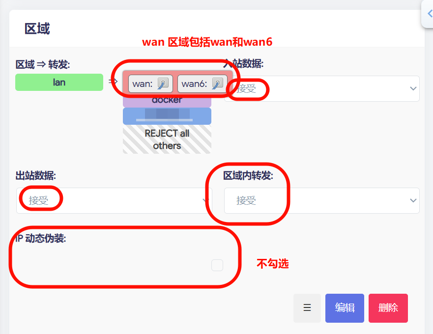 防火墙设置中,确保wan区域的IP动态伪装(NAT)被取消勾选,以减少对 IPv6 流量的潜在干扰。