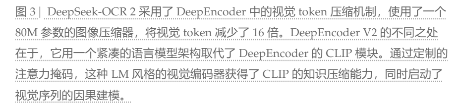 - 提出DeepEncoder V2: 用紧凑型LLM架构替代CLIP组件,引入可学习的因果流查询(causal flow tokens)和定制注意力掩码,实现视觉因果流。
