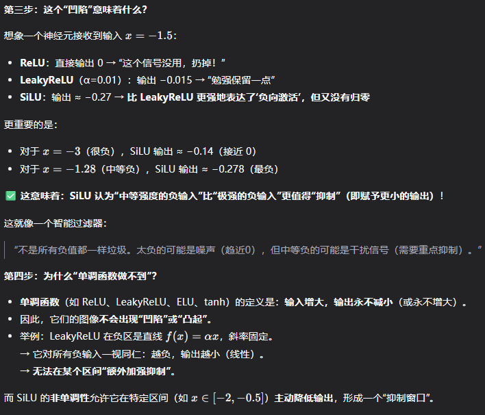 "非单调性"本身不是目的,而是实现 "灵活抑制负输入" 的数学手段。因为 SiLU 是非单调的(有极小值),所以它能在某些负区间输出比两侧更小的值 → 实现"选择性抑制"。