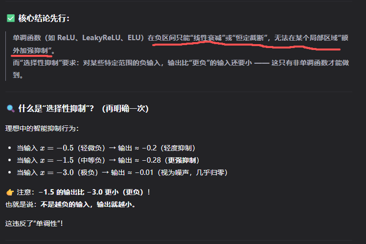 非零中心:激活值覆盖全范围,梯度更新灵活覆盖每一个权重,而不是全部权重。非单调:能够选择性抑制要求,对某些特定范围的负输入,输出比"更负"的输入还要小 ------ 这只有非单调函数才能做到。