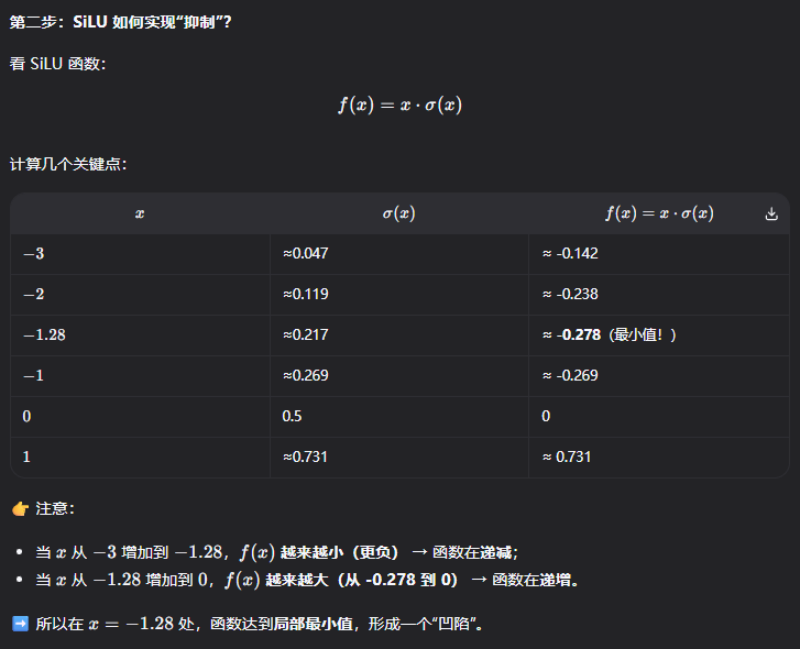 - 非单调性(Non-monotonicity) :这是 SiLU 的精髓。在 x ≈ − 1.28 x \approx -1.28 x≈−1.28 时有一个极小值。这意味着模型可以学到 "稍微抑制负值,而不是像 ReLU 那样直接杀掉它" 。