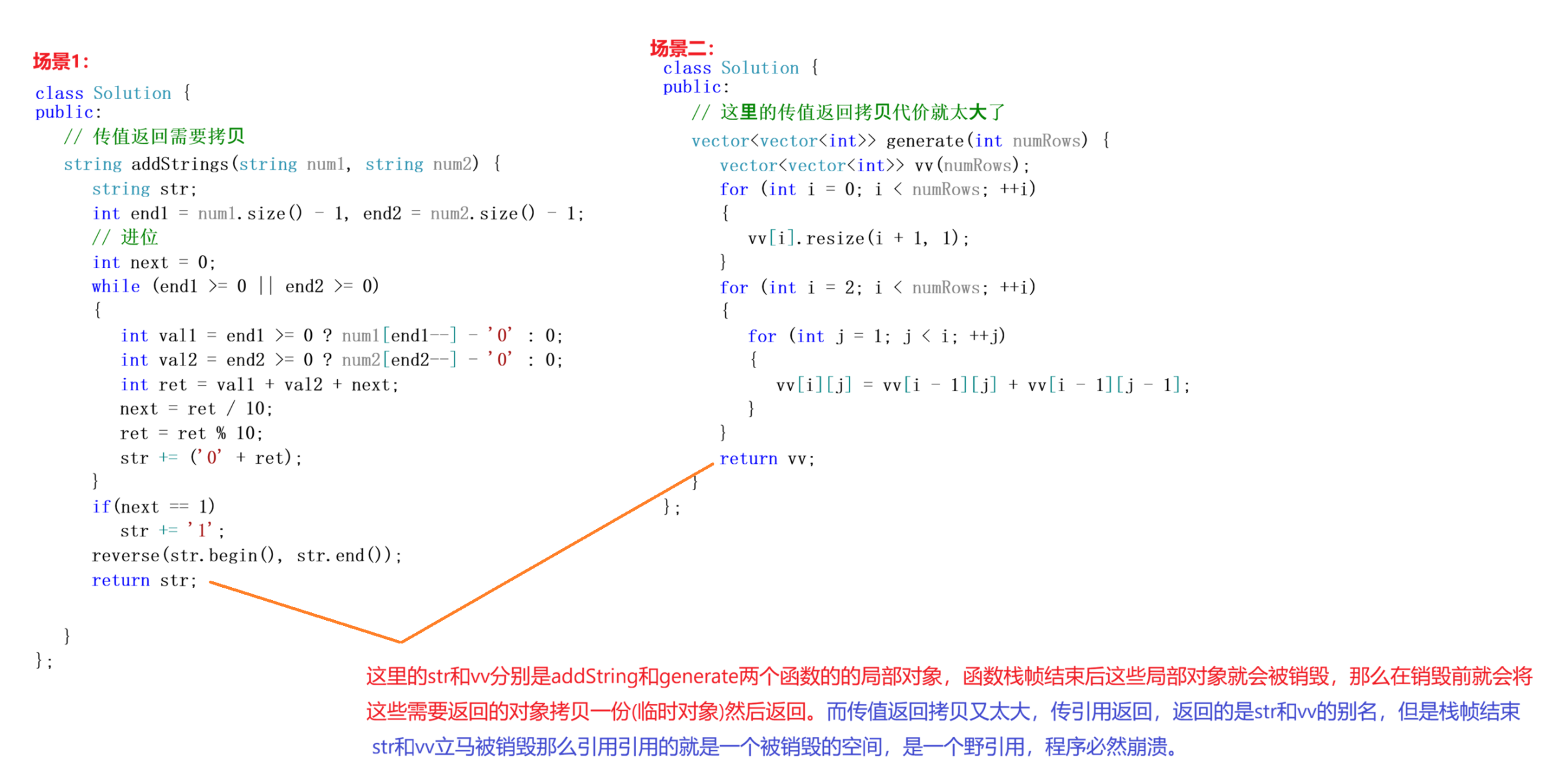 str和vv本质是⼀个局部对象,函数结束这个对象就析构销毁了,右值引⽤返回也⽆法概念对象已经析构销毁的事实。 我们优化的是返回对象所产生的临时对象与接收对象之间的指针指向,从而避免拷贝!