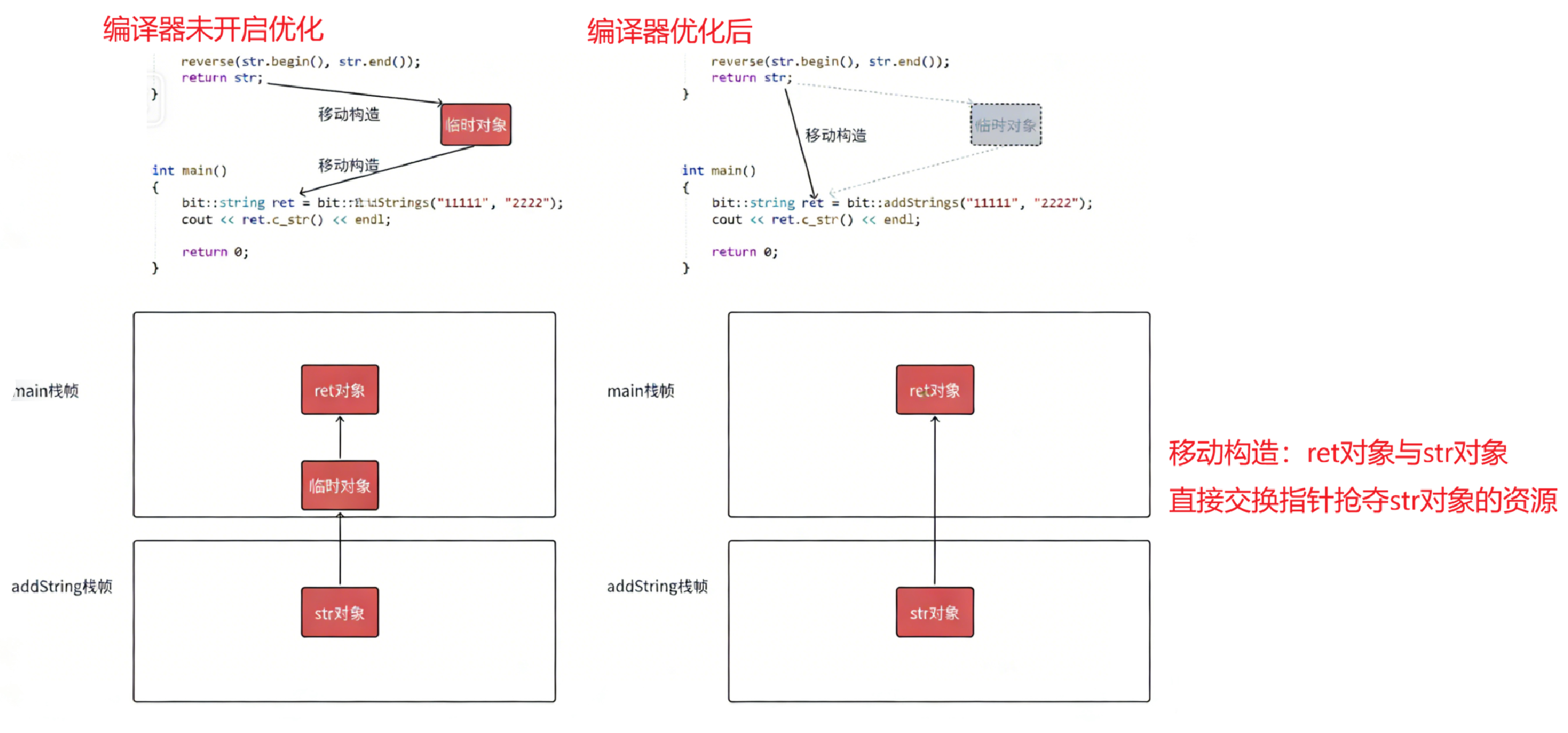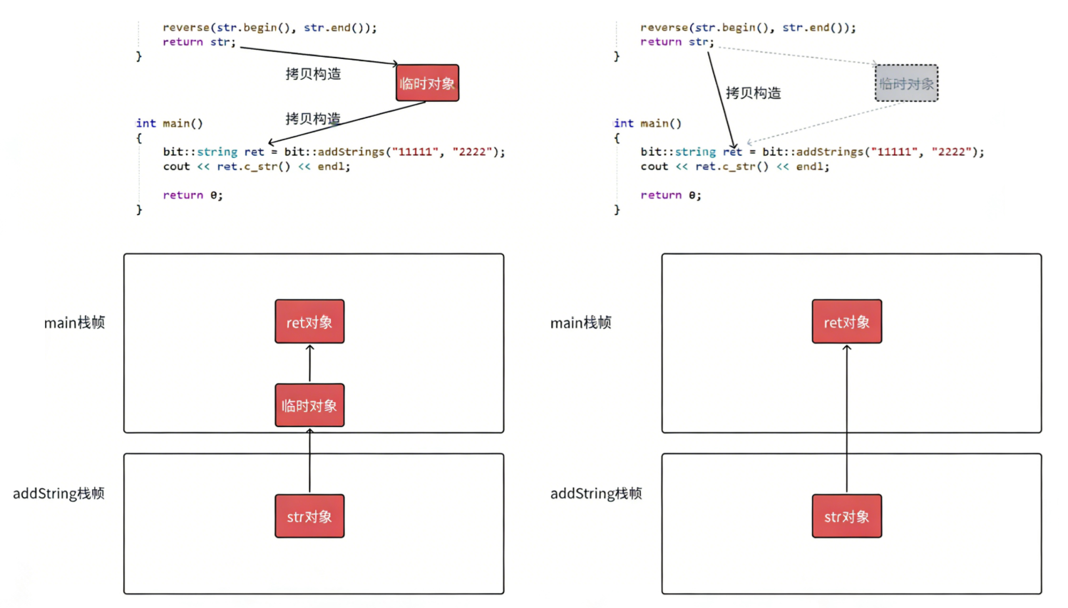 str对象的构造,str拷贝构造临时对象,临时对象拷贝构造ret对象,合三为⼀,变为直接构造。 变为直接构造。要理解这个优化要结合局部对象⽣命周期和栈帧的⻆度理解