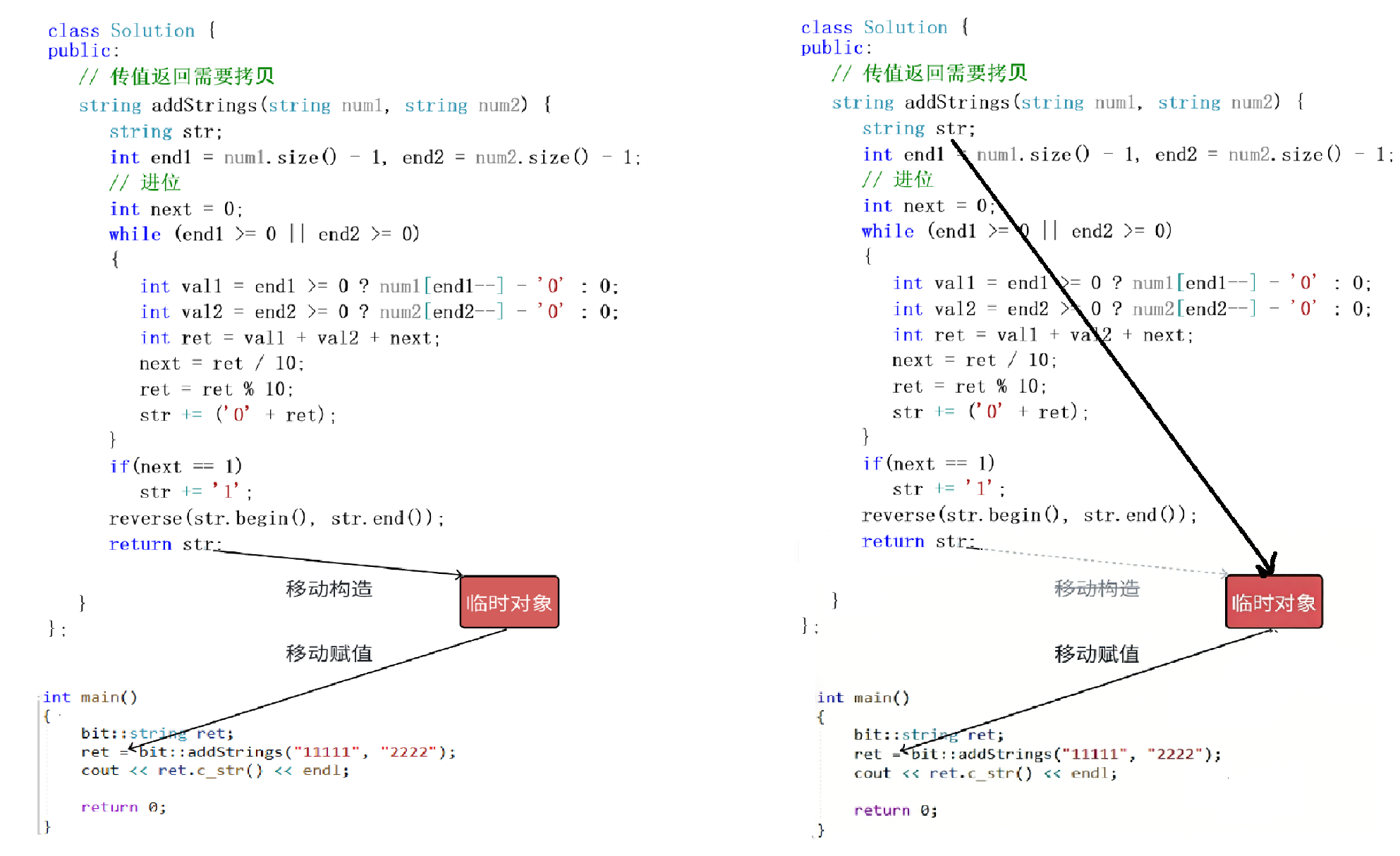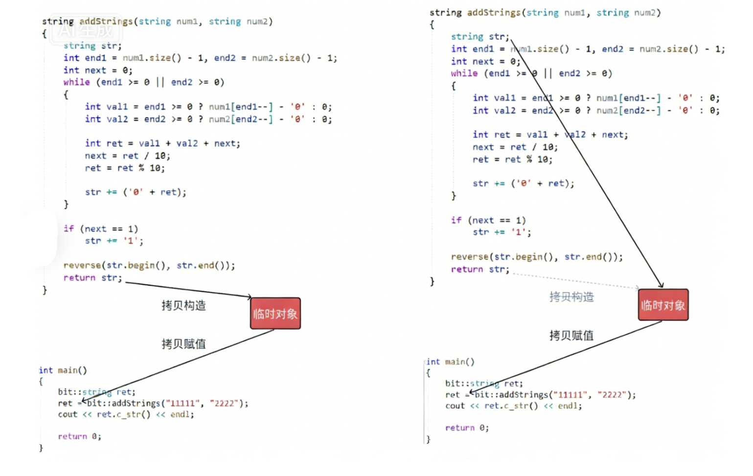 vs2019的release和vs2022的debug和release,右侧代码会进⼀步优化,直接构造要返回的临时对象,str本质是临时对象的引⽤,底层⻆度⽤指针实现。运行结果的角度,我们可以看到str的析构是在赋值以后,说明str就是临时对象的别名。